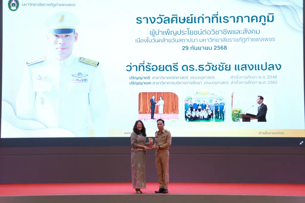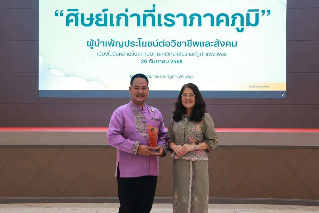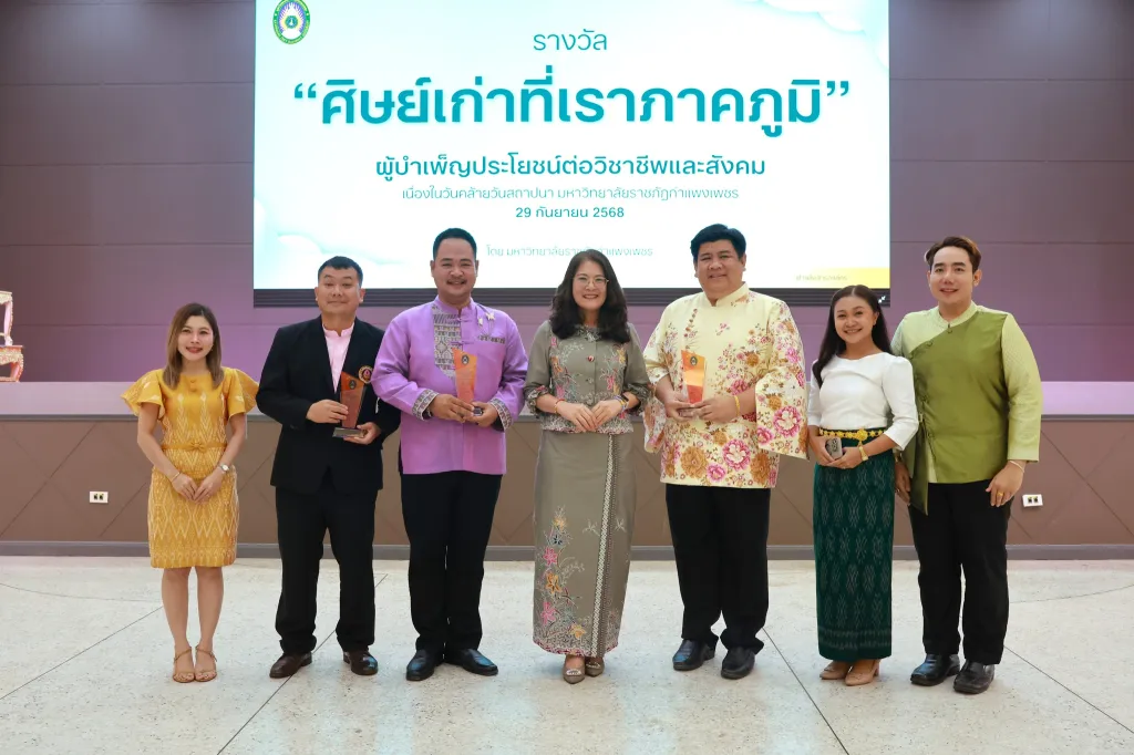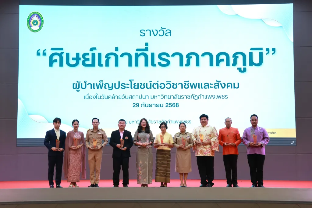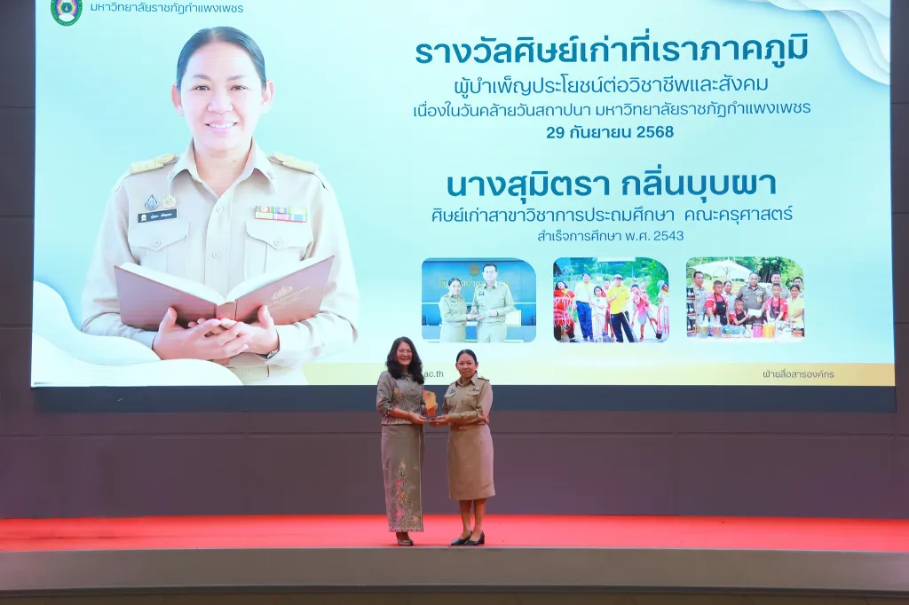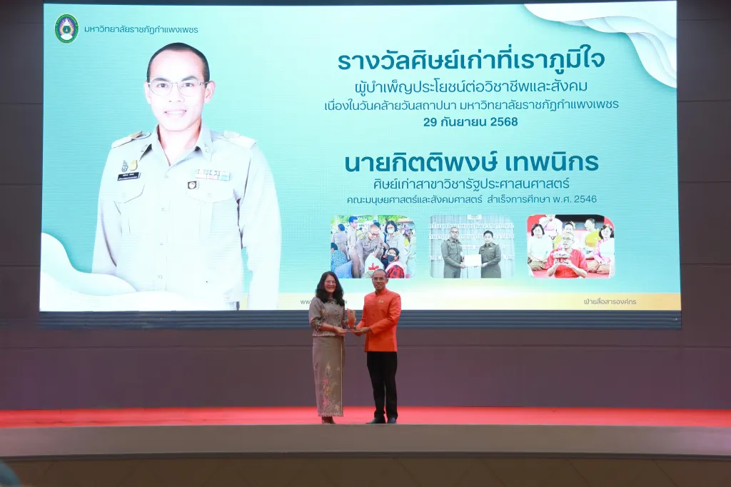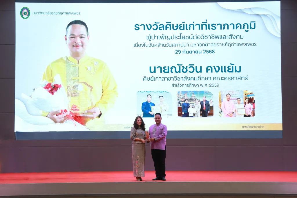 เมื่อวันที่ 29 กันยายน 2568 ที่ห้องประชุมราชพฤกษ์ ชั้น 3 อาคารทีปังกรรัศมีโชติ มหาวิทยาลัยราชภัฏกำแพงเพชร จัดพิธีมอบรางวัลศิษย์เก่าที่เราภาคภูมิ ผู้บำเพ็ญประโยชน์ต่อวิชาชีพและสังคม เนื่องในวันคล้ายวันสถาปนามหาวิทยาลัยราชภัฏกำแพงเพชร 29 กันยายน 2568 โดยมีผู้ช่วยศาสตราจารย์ ดร.ปรียานุช พรหมภาสิต อธิการบดี เป็นผู้มอบรางวัลฯ โดยมีศิษย์เก่าที่ได้รับรางวัลดังต่อไปนี้
