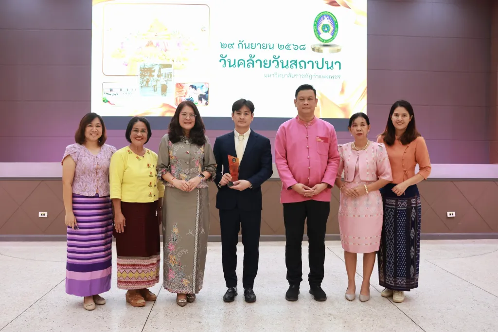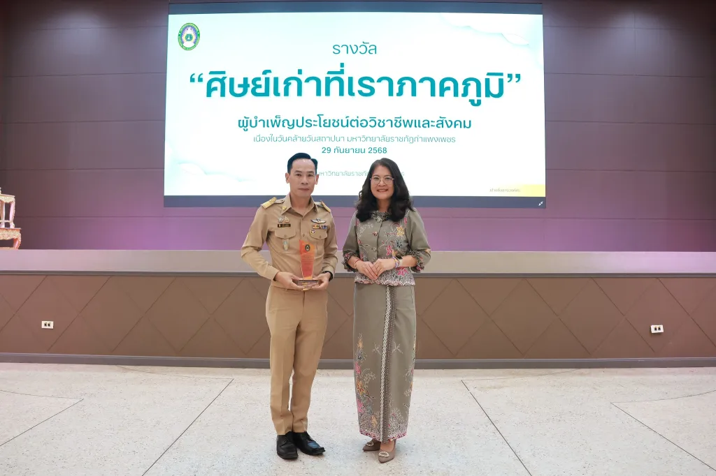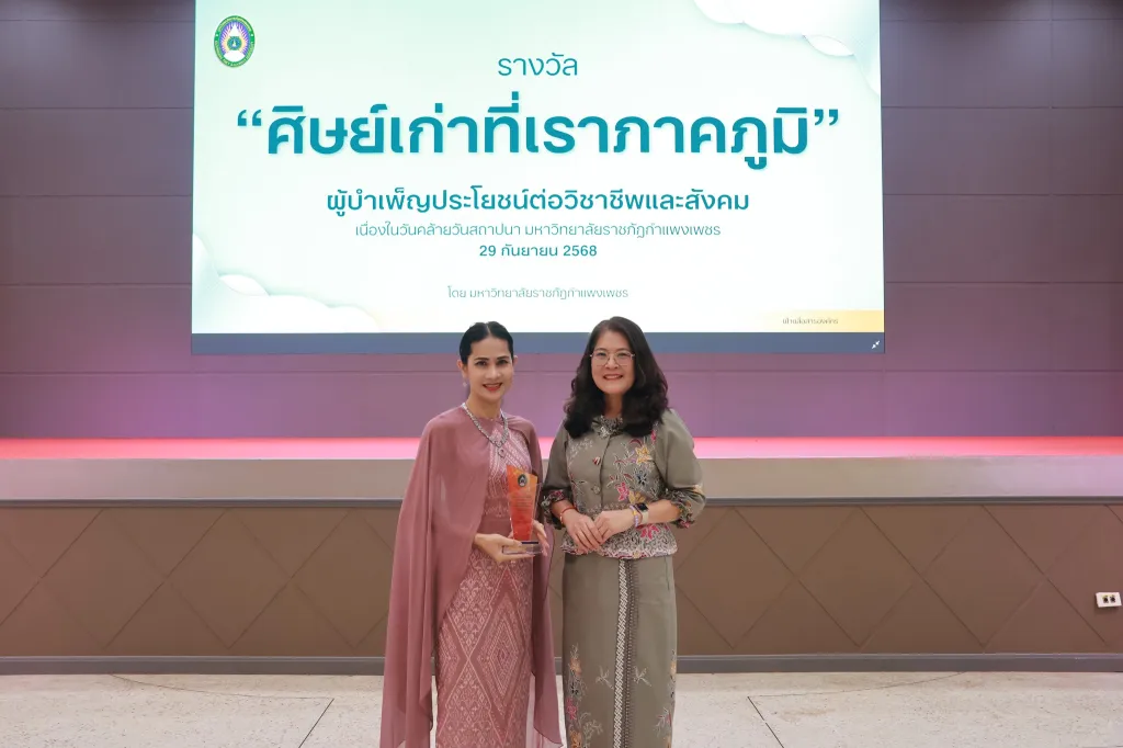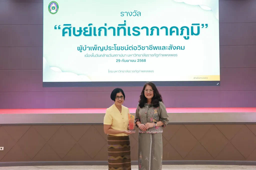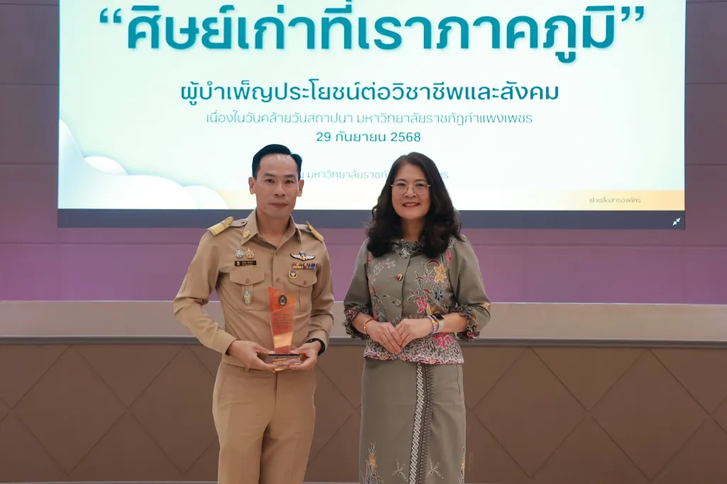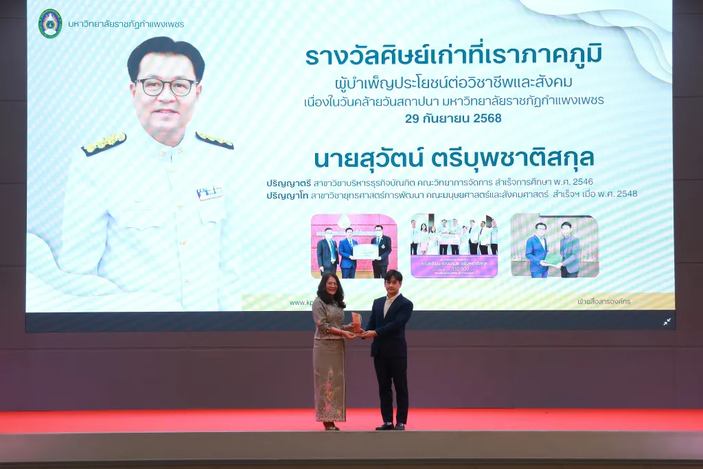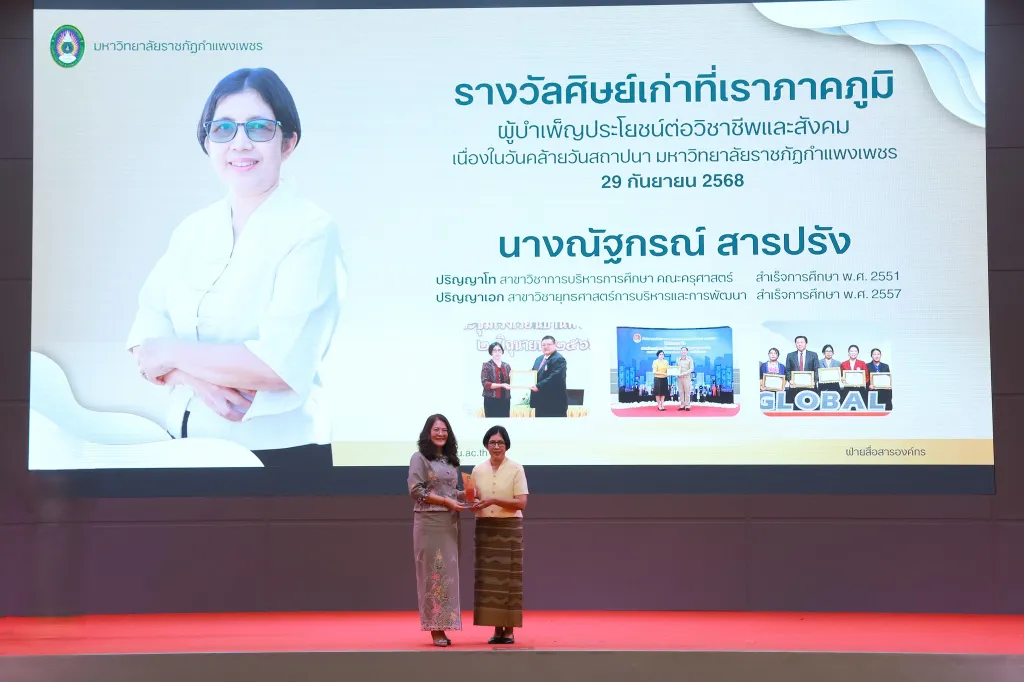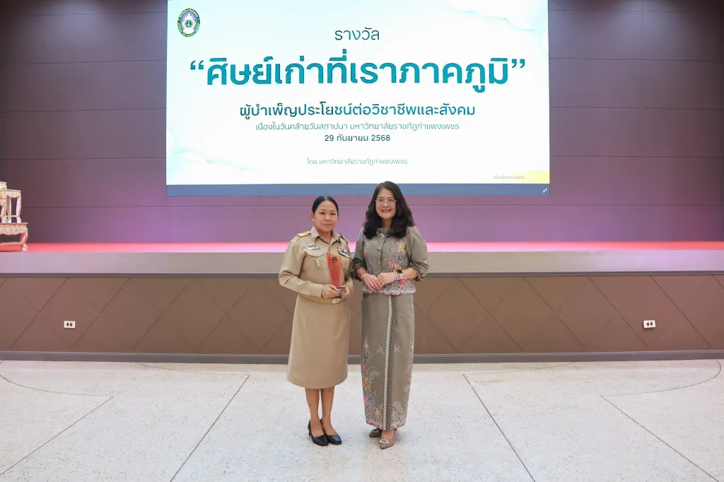 เมื่อวันที่ 29 กันยายน 2568 ที่ห้องประชุมราชพฤกษ์ ชั้น 3 อาคารทีปังกรรัศมีโชติ มหาวิทยาลัยราชภัฏกำแพงเพชร จัดพิธีมอบรางวัลศิษย์เก่าที่เราภาคภูมิ ผู้บำเพ็ญประโยชน์ต่อวิชาชีพและสังคม เนื่องในวันคล้ายวันสถาปนามหาวิทยาลัยราชภัฏกำแพงเพชร 29 กันยายน 2568 โดยมีผู้ช่วยศาสตราจารย์ ดร.ปรียานุช พรหมภาสิต อธิการบดี เป็นผู้มอบรางวัลฯ โดยมีศิษย์เก่าที่ได้รับรางวัลดังต่อไปนี้