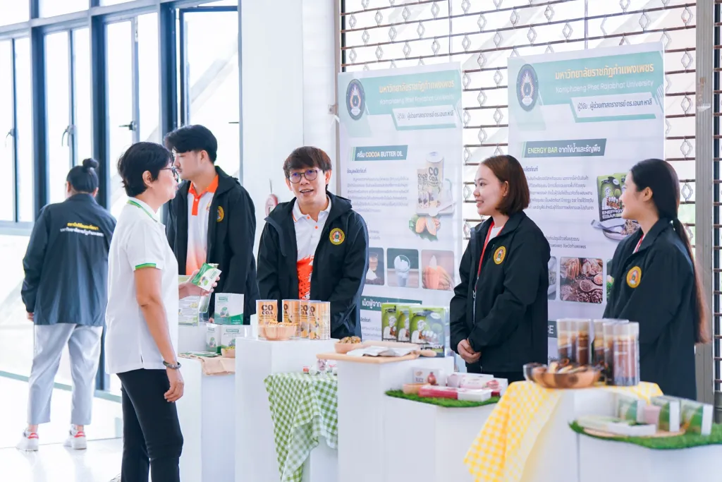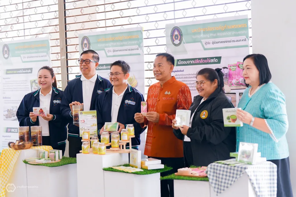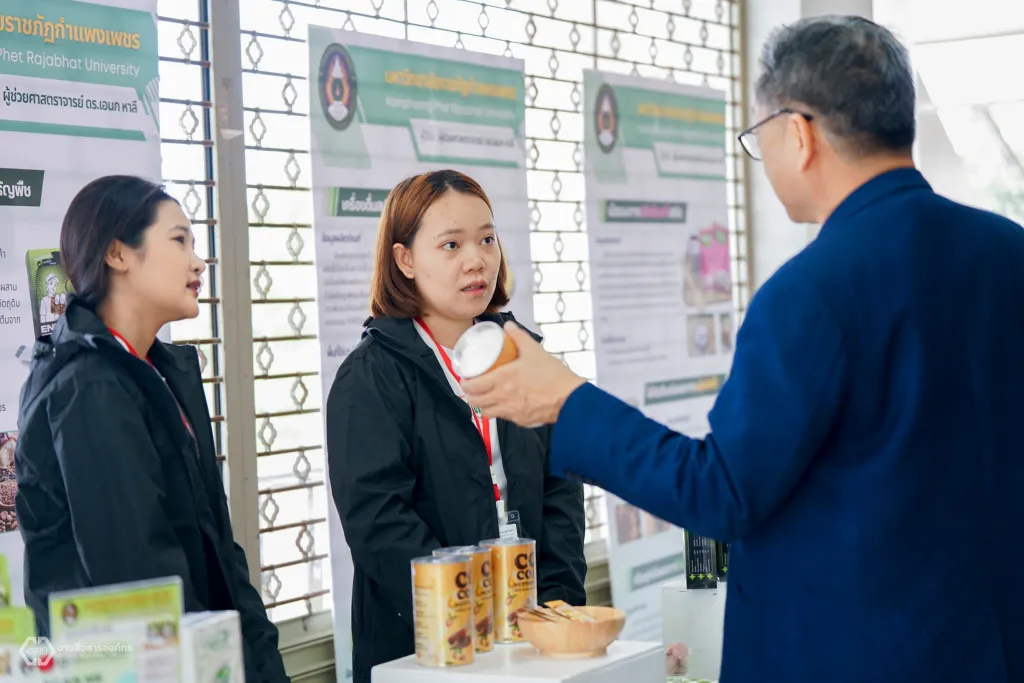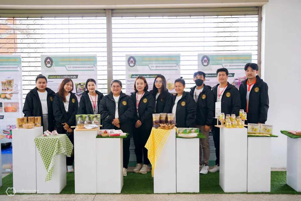 โอกาสนี้ สถาบันวิจัยและพัฒนา มหาวิทยาลัยราชภัฏกำแพงเพชร ได้จัดนิทรรศการแสดงผลิตภัณฑ์จากงานวิจัย โครงการพลิกโฉมมหาวิทยาลัย (Reinventing) และงานบริการวิชาการเข้าร่วม ได้แก่ 1. โปรตีนสกัดชนิดผงจากไข่น้ำ 2. เครื่องดื่มไฮโปรตีนชนิดผงจากเมล็ดโกโก้ 3. ครีมซุปกล้วยไข่ 4. ครีมซุปจากไข่น้ำ 5. เม็ดอมจากปลีกล้วยไข่สกัด