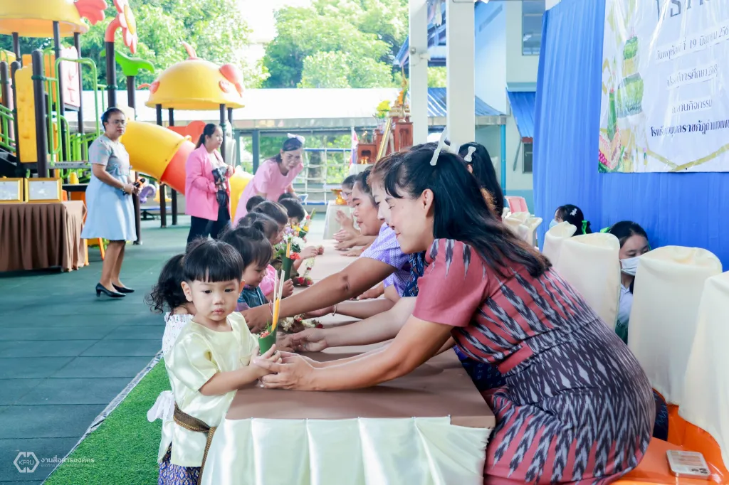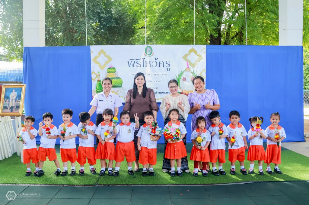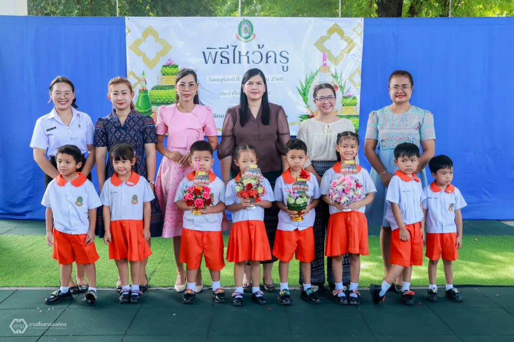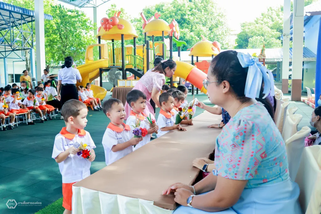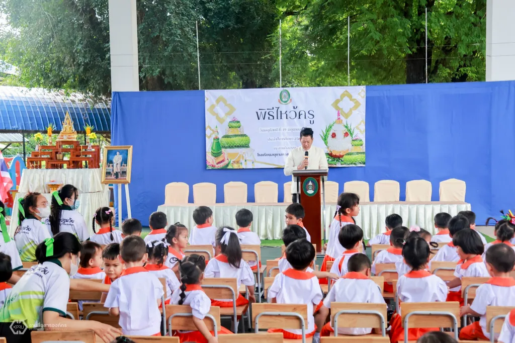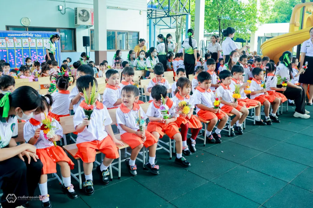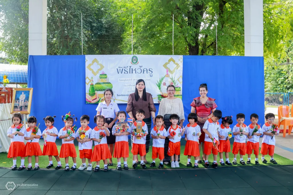 พร้อมด้วยอาจารย์จุฑาทิพย์ โอบอ้อม ผู้อำนวยการโรงเรียน รองผู้อำนวยการ พร้อมด้วบคณะครูประจำชั้นบริบาลและระดับชั้นอนุบาล และนักศึกษาพี่เลี้ยง เข้าร่วมกิจกรรมในครั้งนี้ ภายในกิจกรรม มีตัวแทนนักเรียนทั้งในระดับชั้นบริบาลและอนุบาล ถือพานดอกไม้ ตามด้วยกรวยดอกไม้ ธูปเทียน ที่นักเรียนได้นำมาร่วมพิธีไหว้ครู เพื่อเป็นการแสดคงความเคารพต่อคุณครู