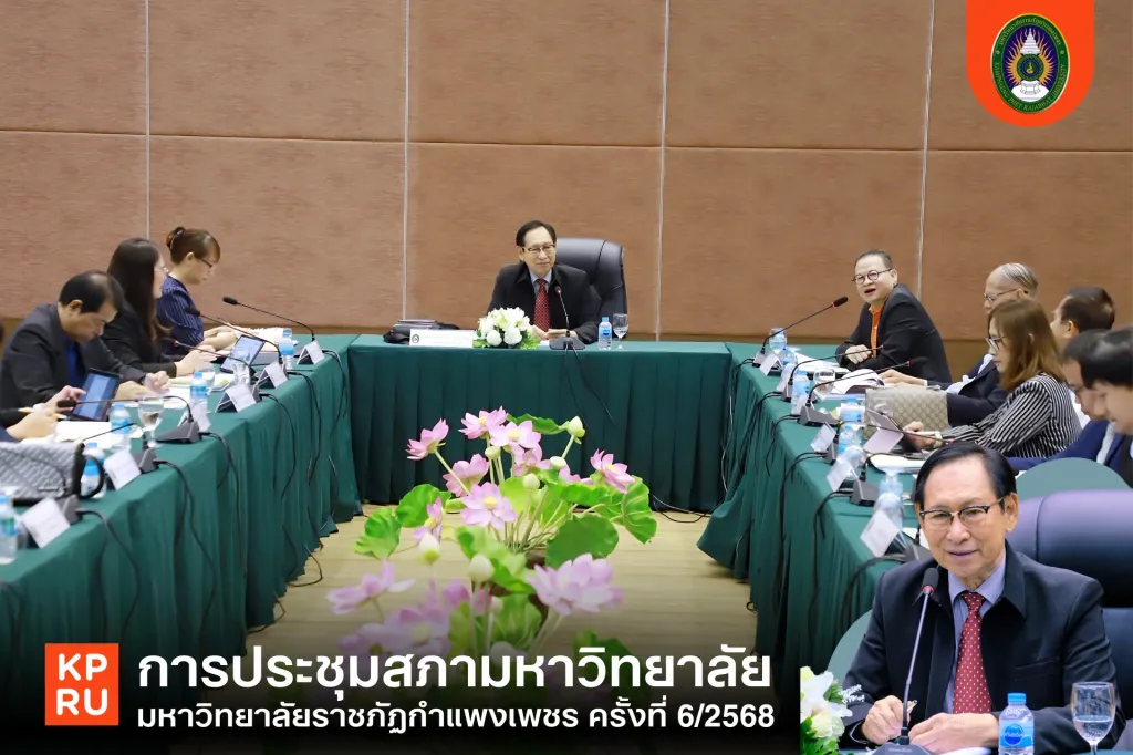 การประชุมสภามหาวิทยาลัยราชภัฏกำแพงเพชร ครั้งที่ 6/ 2568 วันที่ 19 มิถุนายน พ.ศ. 2568 รองศาสตราจารย์ ดร.สมบัติ นพรัก นายกสภามหาวิทยาลัยราชภัฏกำแพงเพชร เป็นประธานในการประชุมสภามหาวิทยาลัยราชภัฏกำแพงเพชร
