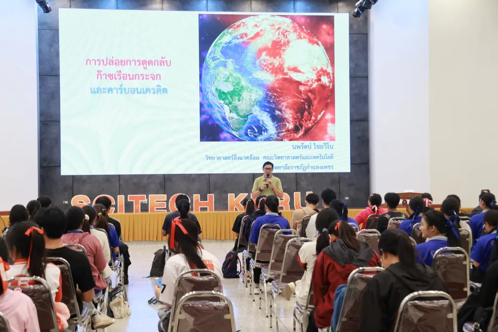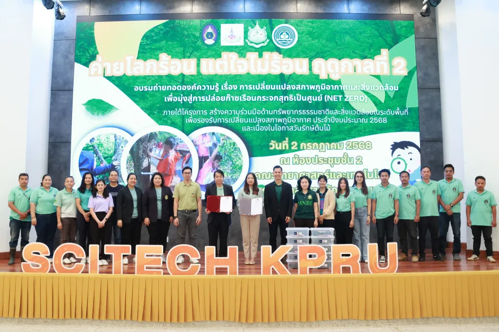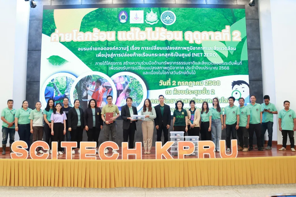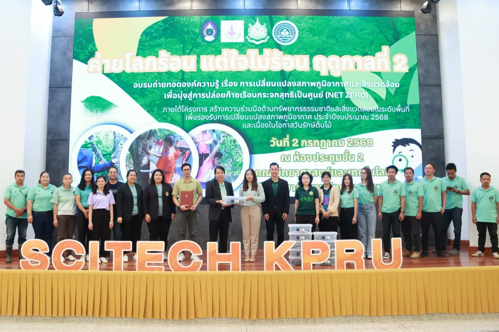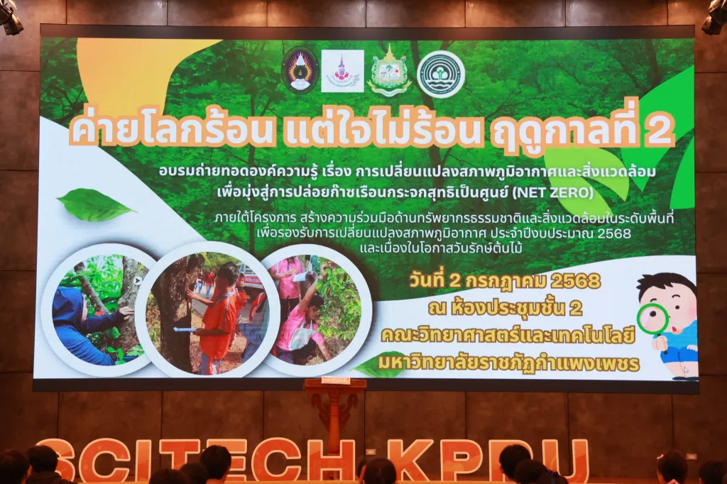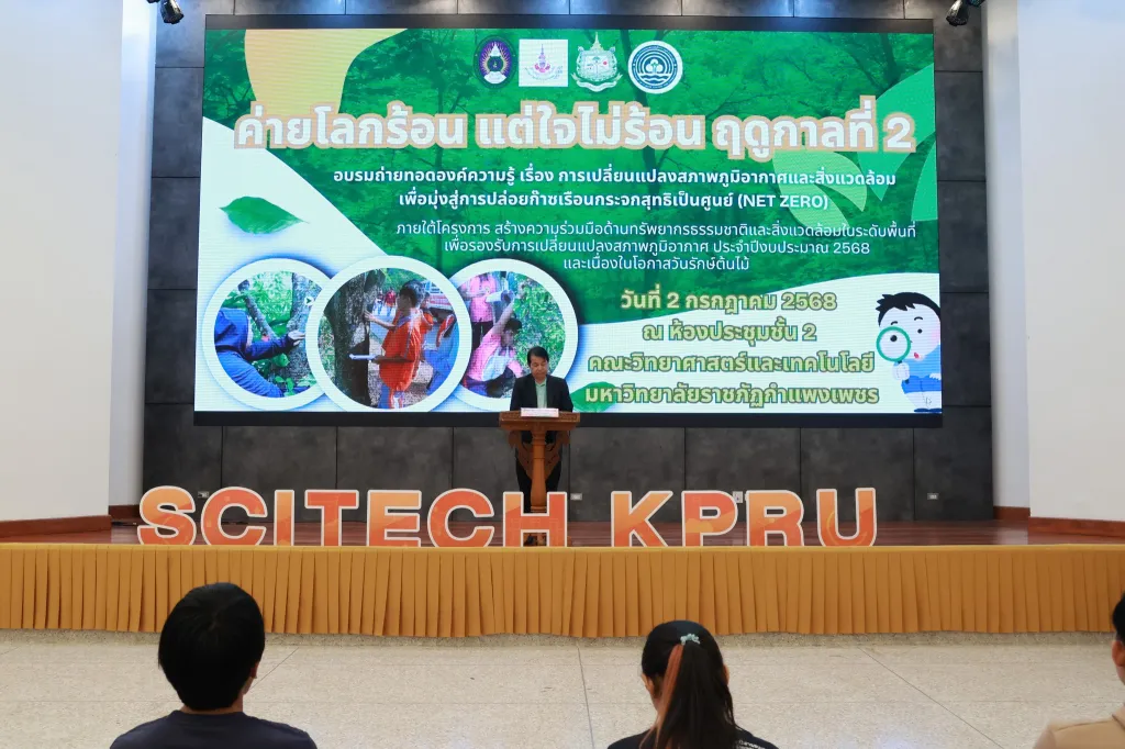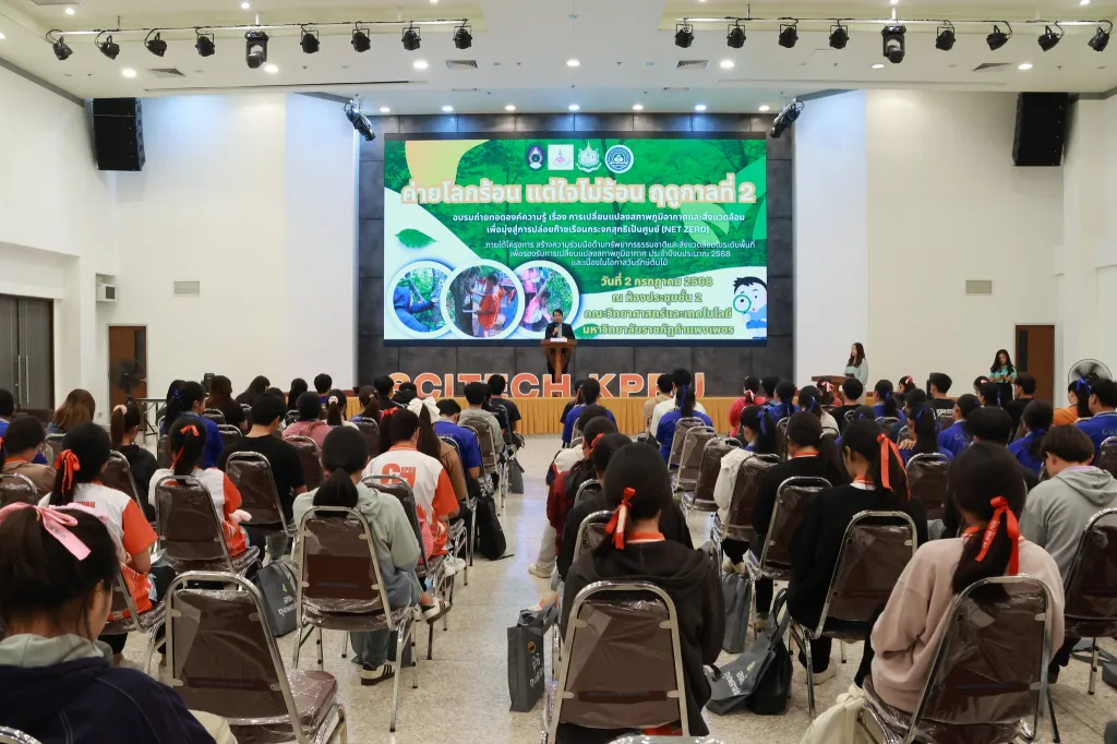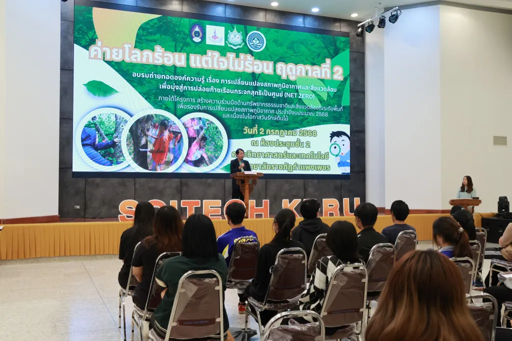 วันที่ 2 กรกฎาคม 2568 ผู้ช่วยศาสตราจารย์ ดร.ชัชชัย พวกดี รองอธิการบดีฝ่ายบริหาร เป็นประธานในพิธีเปิดกิจกรรมการอบรมถ่ายทอดองค์ความรู้ เรื่อง การเปลี่ยนแปลงสภาพภูมิอากาศและสิ่งแวดล้อม เพื่อมุ่งสู่การปล่อยก๊าซเรือนกระจกสุทธิเป็นศูนย์ (Net zero) (ค่ายโลกร้อน แต่ใจไม่ร้อน ฤดูกาลที่ 2) โดยมีนักศึกษาชั้นปีที่ 2 และ 3 คณะครุศาสตร์ และคณะมนุษยศาสตร์และสังคมศาสตร์ เข้าร่วมกิจกรรมฯ ณ ห้องประชุม ชั้น 2 อาคารคณะวิทยาศาสตร์และเทคโนโลยี มหาวิทยาลัยราชภัฏกำแพงเพชร