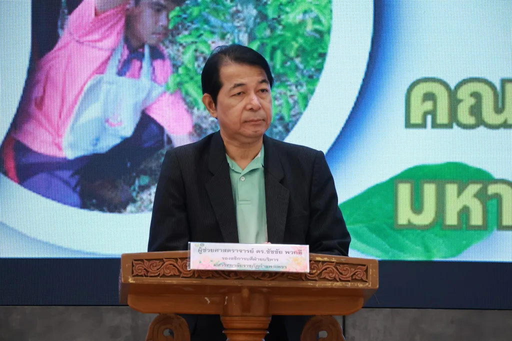 ผู้ช่วยศาสตราจารย์ ดร.ชัชชัย พวกดี รองอธิการบดีฝ่ายบริหาร กล่าวว่า มหาวิทยาลัยฯ ขอขอบคุณและมีความยินดีที่หน่วยงานกระทรวงทรัพยากรธรรมชาติและสิ่งแวดล้อม มาร่วมจัดอบรมถ่ายทอดองค์ความรู้ ซึ่งมหาวิทยาลัยหวังว่าการจัดอบรมฯ ในวันนี้ จะมีส่วนช่วยให้นักศึกษามหาวิทยาลัยราชภัฏกำแพงเพชร ได้รับความรู้ความเข้าใจด้านการเปลี่ยนแปลงสภาพภูมิอากาศและสิ่งแวดล้อม ซึ่งนักศึกษาจะเป็นกลุ่มเยาวชนคนรุ่นใหม่ที่จะเป็นกำลังสำคัญของประเทศไทยในอนาคตต่อไป