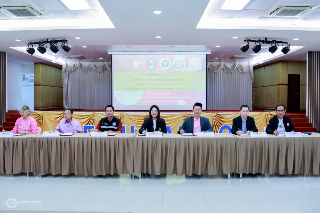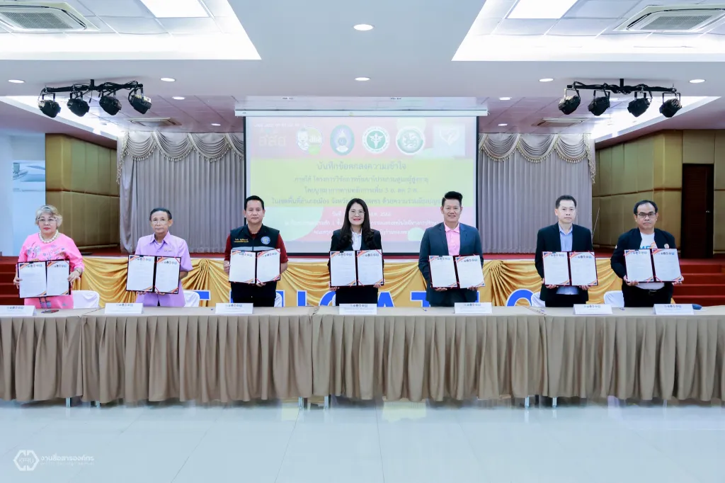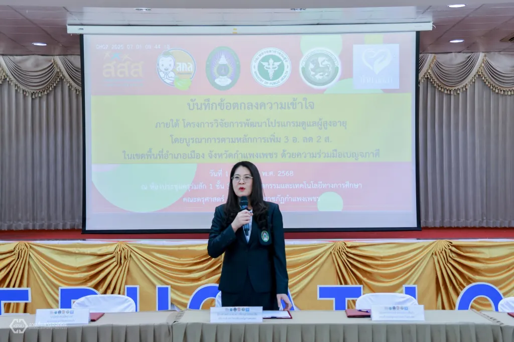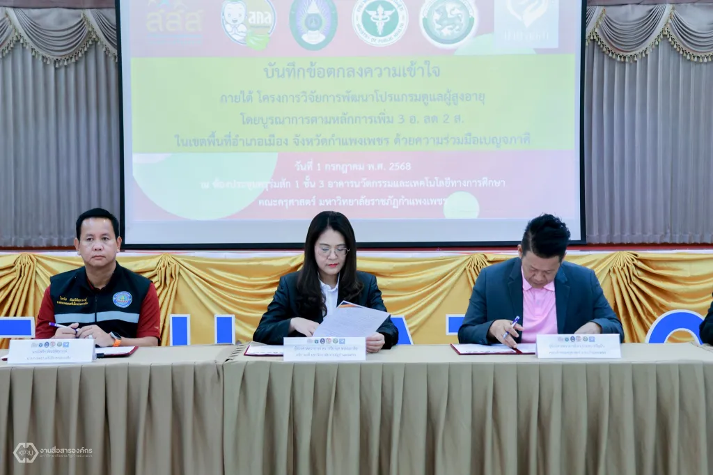 วันที่ 1 กรกฎาคม 2568 ผู้ช่วยศาสตราจารย์ ดร.ปรียานุช พรหมภาสิต อธิการบดีมหาวิทยาลัยราชภัฏกำแพงเพชร ลงนามบันทึกความเข้าใจโครงการวิจัยการพัฒนาโปรแกรมดูแลผู้สูงอายุ โดยบูรณาการตามหลักการเพิ่ม 3 อ. ลด 2 ส. ในเขตพื้นที่อำเภอเมือง จังหวัดกำแพงเพชร ด้วยความร่วมมือเบญจภาคี กับสำนักงานสาธารณสุข อำเภอเมือง จังหวัดกำแพงเพชร บ้านลลิสา เนอร์สซิ่งโฮม กำแพงเพชร เครือข่ายองค์กรงดเหล้าจังหวัดกำแพงเพชร เทศบาลตำบลนครชุม เทศบาลตำบลหนองปลิง องค์การบริหารส่วนตำบลลานดอกไม้ องค์การบริหารส่วนตำบลนาบ่อคำ องค์การบริหารส่วนตำบลคลองแม่ลาย และองค์การบริหารส่วนตำบลทรงธรรม พร้อมด้วยผู้ช่วยศาสตราจารย์ ดรงประจบ ขวัญมั่น คณบดีคณะครุศาสตร์ และอาจารย์อรทัย อนุรักษ์วัฒนะ หัวหน้าทีมนักวิจัยฯ ร่วมลงนาม ณ ห้องประชุมคุรุร่มสัก 2 ชั้น 3 อาคารคณะครุศาสตร์ มหาวิทยาลัยราชภัฏกำแพงเพชร