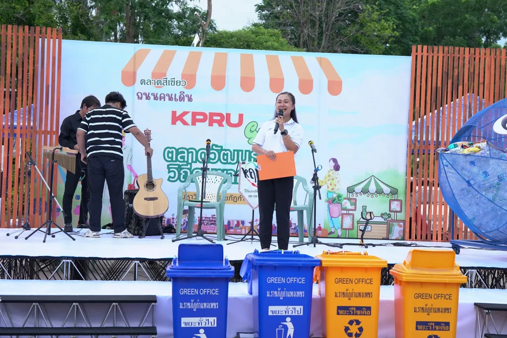 ดร.มะลิวัลย์ รอดกำเหนิด ผู้อำนวยการกองกลาง สำนักงานอธิการบดี มหาวิทยาลัยราชภัฏกำแพงเพชร กล่าวรายงานว่า โครงการตลาดสีเขียว “ถนนคนเดิน KPRU GREEN PING ตลาดวัฒนธรรม วิถีคนชากังราว” ของมหาวิทยาลัยราชภัฏกำแพงเพชร เป็นแหล่งเรียนรู้สำคัญสำหรับการเปลี่ยนแปลงเชิงพฤติกรรมทางด้านสิ่งแวดล้อมสู่ความยั่งยืน ได้แก่ การเสริมสร้างความมั่นคงทางอาหาร การรักษาวัฒนธรรมท้องถิ่น การสร้างความสามารถในการแข่งขันของผลิตภัณฑ์ชุมชน การถ่ายทอดภูมิปัญญาท้องถิ่น พัฒนาทักษะผู้ประกอบการ สร้างจิตสำนึกต่อสิ่งแวดล้อม เสริมสร้างรายได้ให้กับนักศึกษา บุคลากรและชุมชน การเป็นต้นแบบการจัดการคาร์บอนเครดิต (Carbon Credit) และการปรับสมดุลในการพัฒนาระบบบริหารจัดการ มีแนวทางปฏิบัติและสร้างความร่วมมือร่วมกันของบุคลากร นักศึกษา ของมหาวิทยาลัยราชภัฏกำแพงเพชร และชุมชน