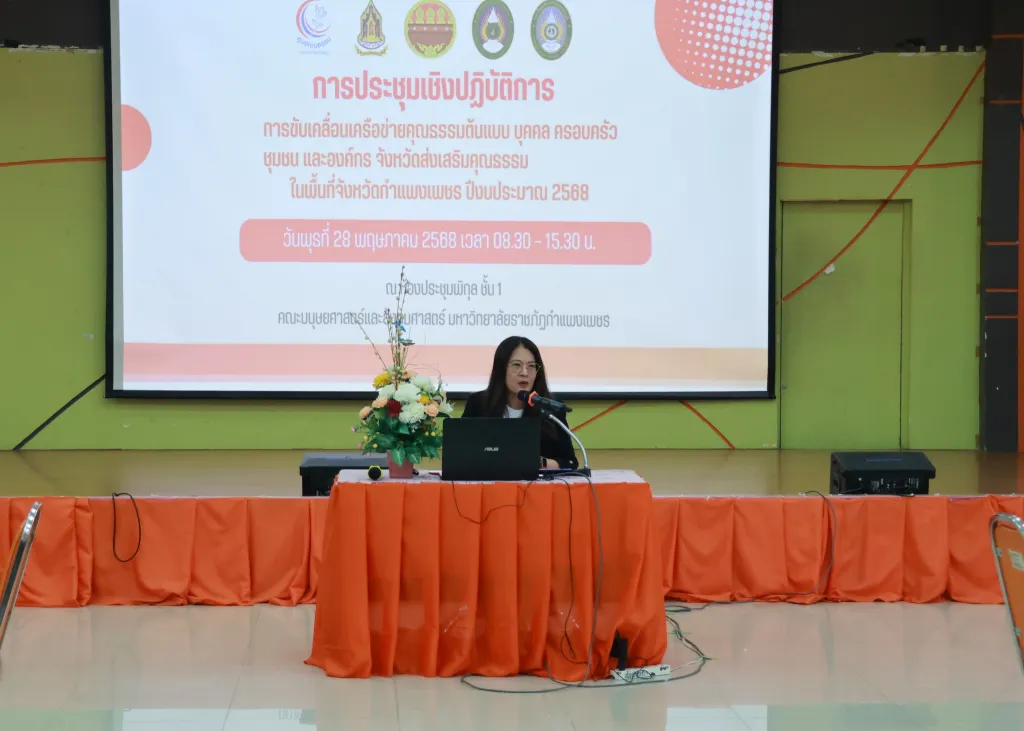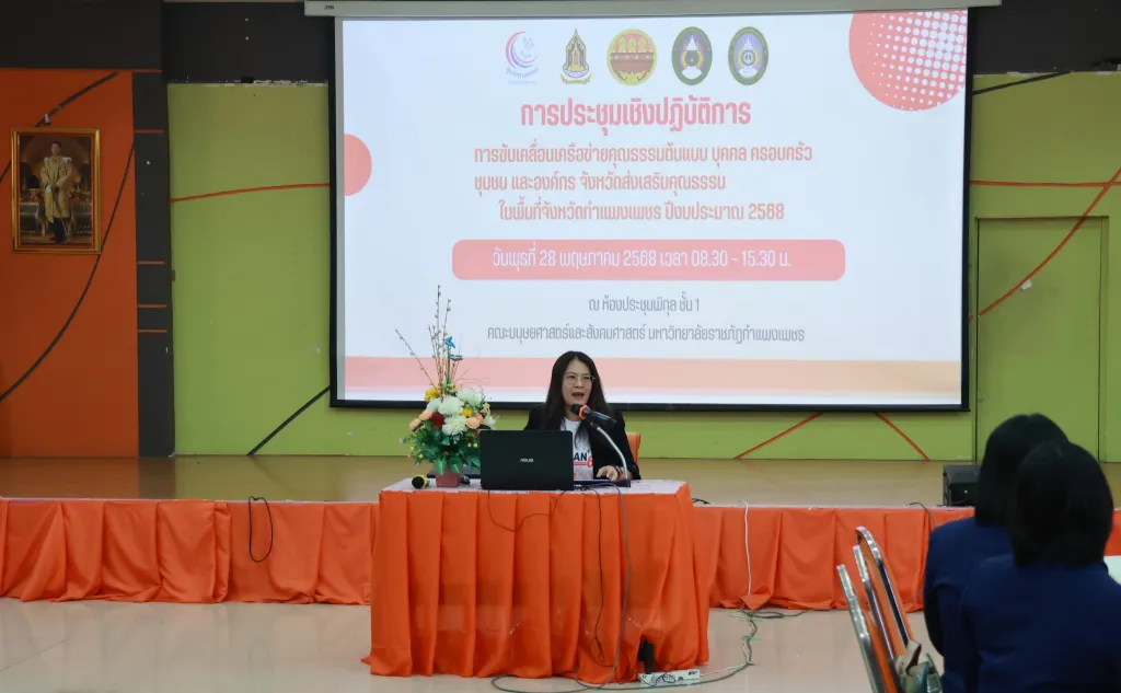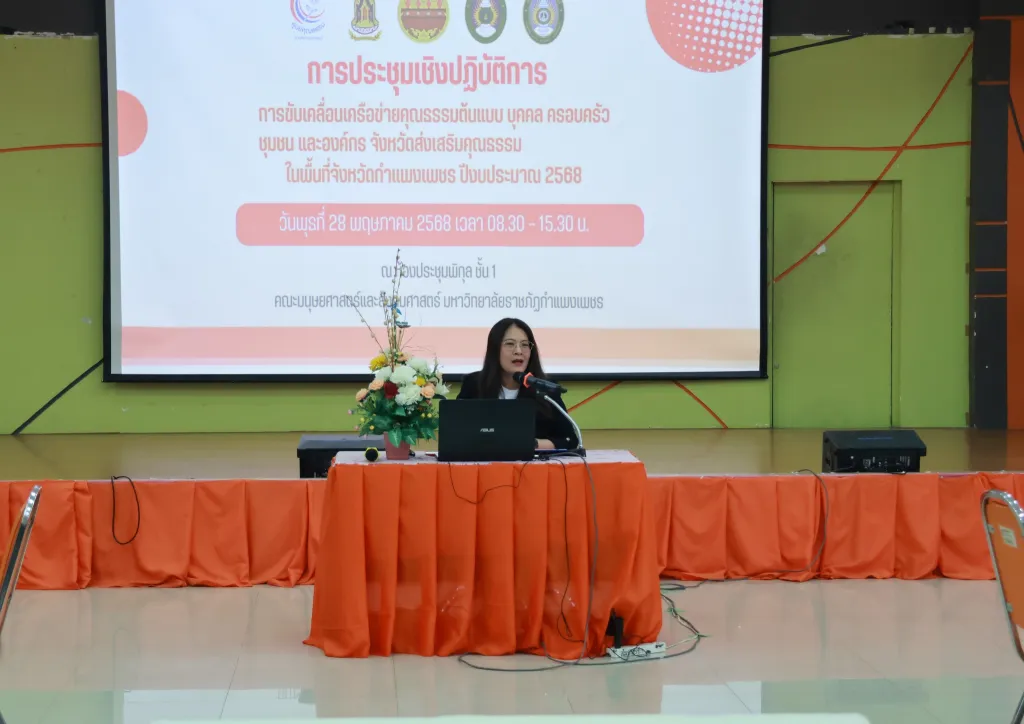 วันที่ 28 พฤษภาคม 2568 ผู้ช่วยศาสตราจารย์ ดร.ปรียานุช พรหมภาสิต อธิการบดี เป็นประธานเปิดโครงการประชุมเชิงปฏิบัติการ การขับเคลื่อนเครือข่ายคุณธรรมต้นแบบ บุคคล ครอบครัว ชุมชน และองค์กร จังหวัดส่งเสริมคุณธรรม ในพื้นที่จังหวัดกำแพงเพชร ประจำปีงบประมาณ 2568 ณ ห้องประชุมพิกุล ชั้น 1 อาคารคณะมนุษยศาสตร์และสังคมศาสตร์ มหาวิทยาลัยราชภัฏกำแพงเพชร
