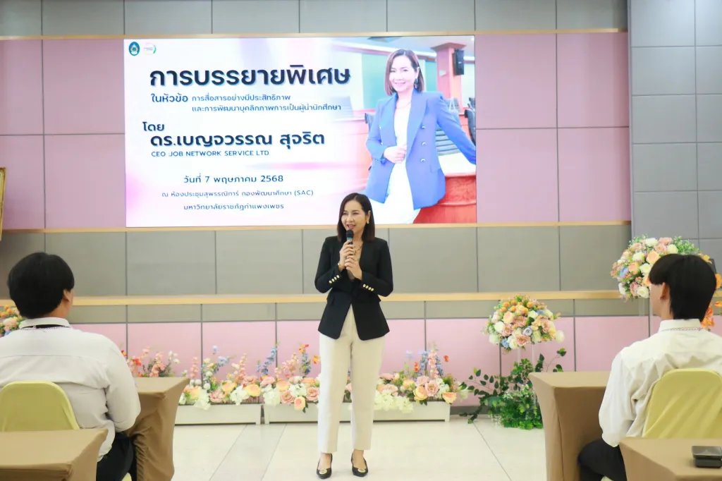 วันที่ 7 พฤษภาคม 2568 ผู้ช่วยศาสตราจารย์ ดร.ปรียานุช พรหมภาสิต อธิการบดี เป็นประธานในพิธีเปิดกิจกรรมสัมมนาผู้นำนักศึกษา ให้กับนักศึกษาองค์การบริหารนักศึกษา สโมสรนักศึกษาทั้ง 6 คณะ และสโมสรนักศึกษามหาวิทยาลัยราชภัฏกำแพงเพชร แม่สอด ประจำปีการศึกษา 2568 ณ ห้องประชุมสุพรรณิการ์ ชั้น 3 อาคารกิจกรรมนักศึกษา มหาวิทยาลัยราชภัฏกำแพงเพชร