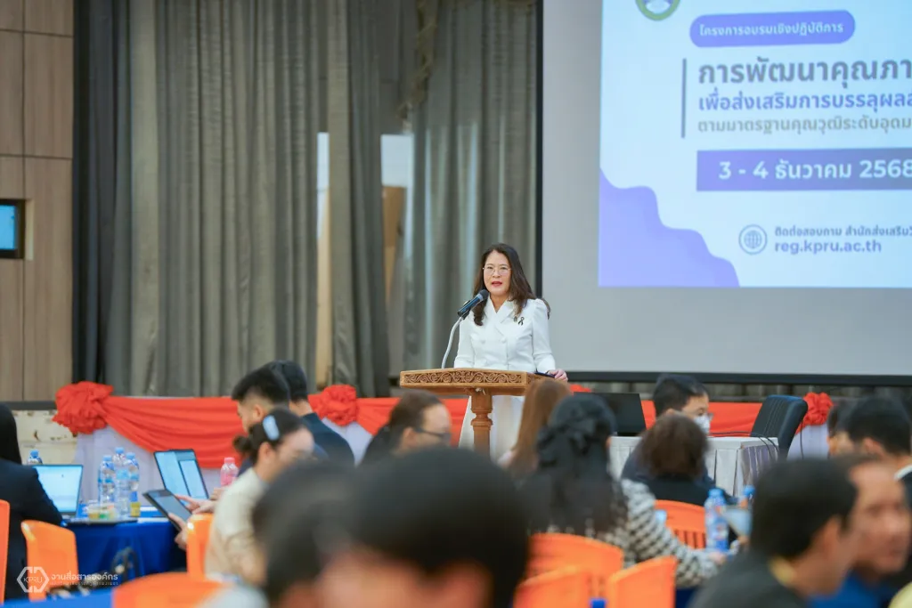 วันที่ 3 ธันวาคม 2568 ผู้ช่วยศาสตราจารย์ ดร.ปรียานุช พรหมภาสิต อธิการบดี เป็นประธานในพิธีเปิดโครงการการอบรมเชิงปฏิบัติการ เรื่อง “การพัฒนาคุณภาพอาจารย์เพื่อส่งเสริมการบรรลุผลลัพธ์การเรียนรู้ตามมาตรฐานคุณวุฒิระดับอุดมศึกษา พ.ศ.2566” จัดโดยสำนักส่งเสริมวิชการและงานทะเบียน ระหว่างวันที่ 3 - 4 ธันวาคม 2568 ณ หอประชุมรัตนอาภา มหาวิทยาลัยราชภัฏกำแพงเพชร