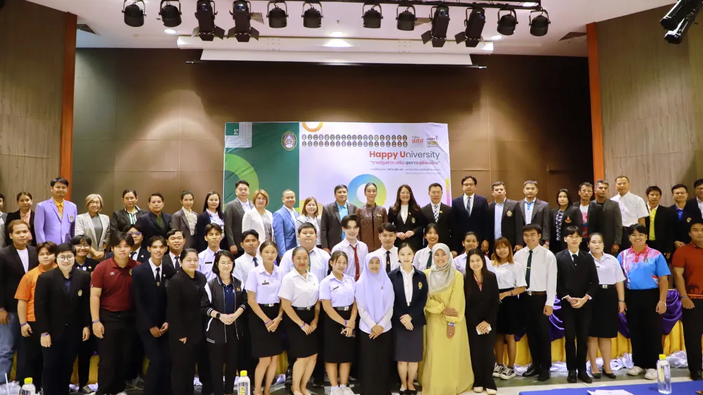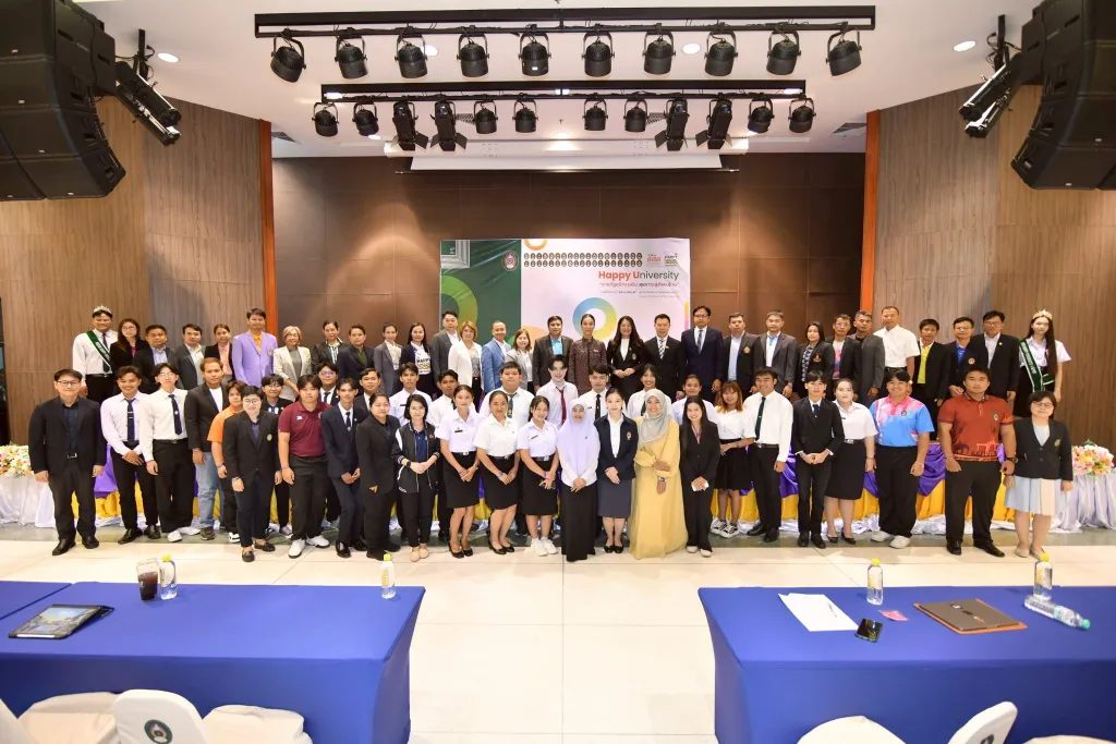 วันที่ 23 พฤษภาคม 2568 นางสาวสุชาดา ซาง แทนทรัพย์ เลขานุการรัฐมนตรีว่าการกระทรวงการอุดมศึกษา วิทยาศาสตร์ วิจัยและนวัตกรรม (อว.) เป็นประธานในพิธีเปิด เวที Happy University ราชภัฏสร้าง เสริม สุขภาวะสู่สังคมไทย ภายใต้โครงการ "สร้าง เสริม สุข" มหาวิทยาลัยราชภัฏไปสู่สังคมสุขภาวะ โดยมีนายพงษ์ศักดิ์ ธงรัตนะ ผู้อำนวยการสำนักสนับสนุนสุขภาวะองค์กร สำนักงานกองทุนสนับสนุนการสร้างเสริมสุขภาพ (สสส.) ผศ.ดร.ปรียานุช พรหมภาสิต อธิการบดีมหาวิทยาลัยราชภัฏกำแพงเพชร และคณะผู้บริหาร คณาจารย์ และนักศึกษามหาวิทยาลัยราชภัฏทั่วประเทศ เข้าร่วมฯ ณ ห้องประชุมครุศาสตร์สัมมนา 4 ชั้น 12 คณะครุศาสตร์ มหาวิทยาลัยราชภัฏจันทรเกษม กรุงเทพมหานคร