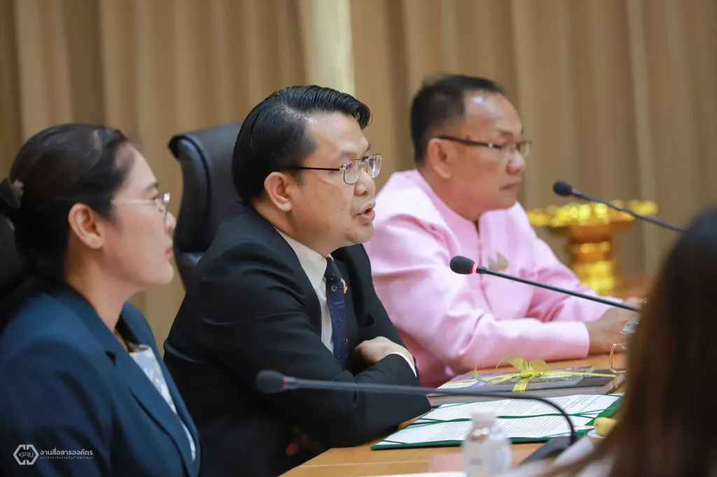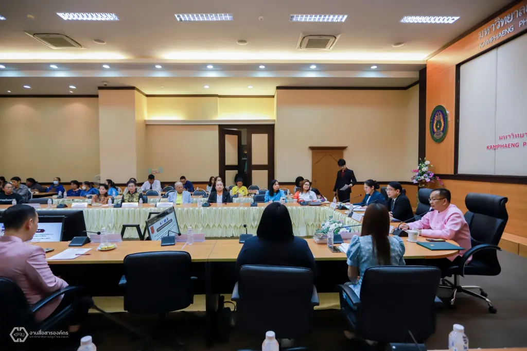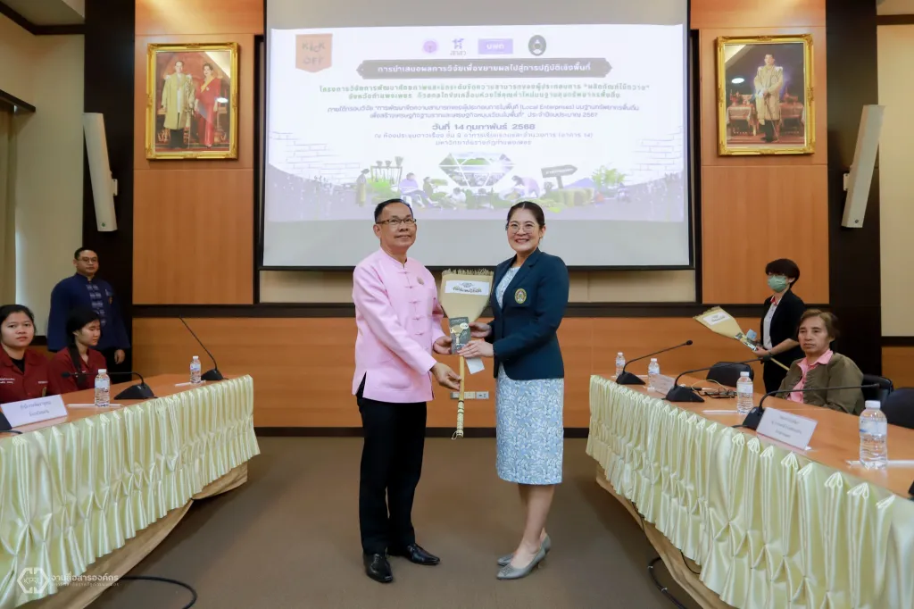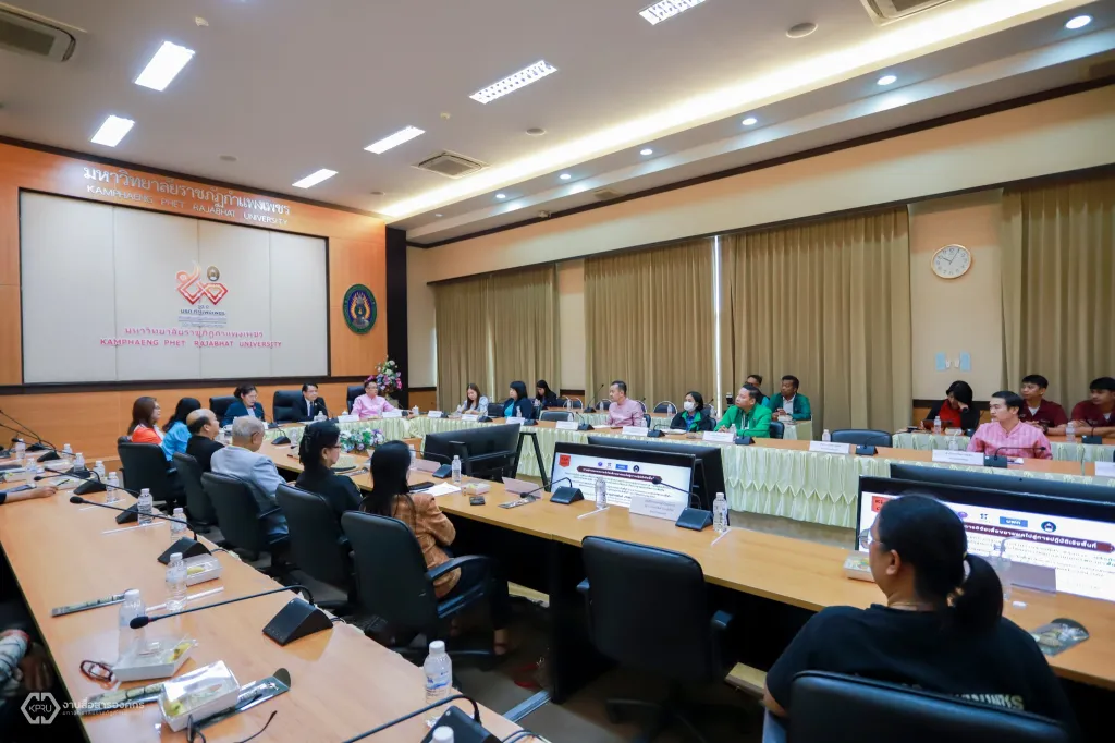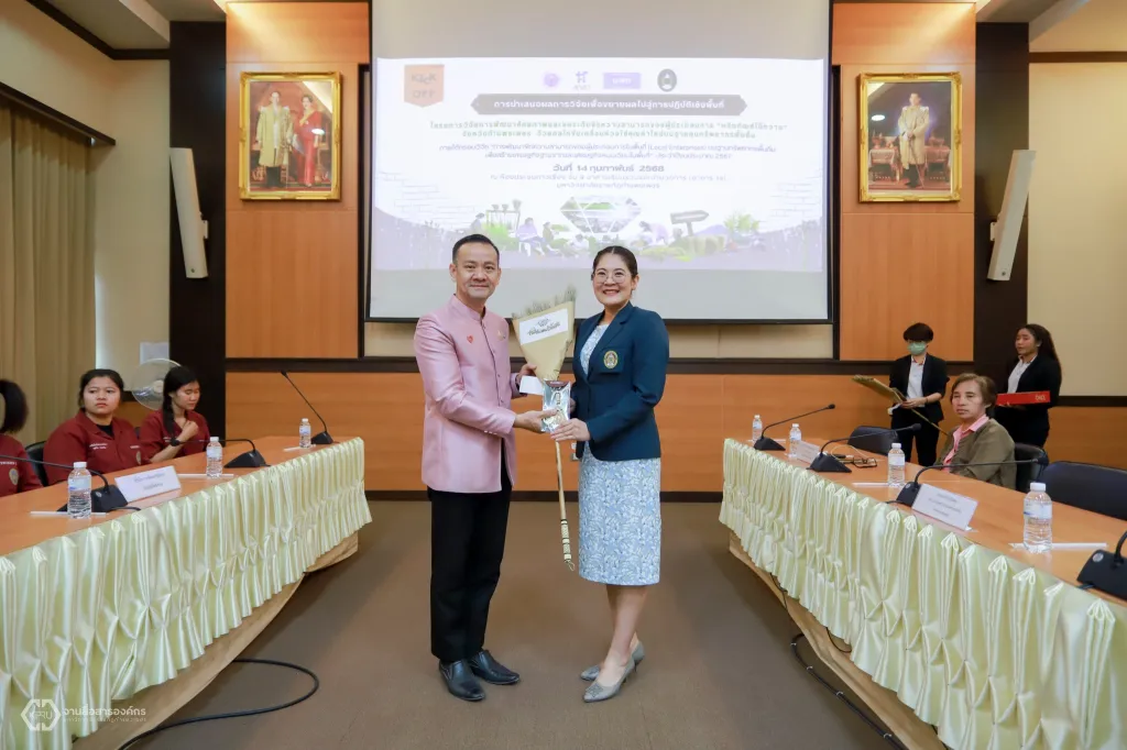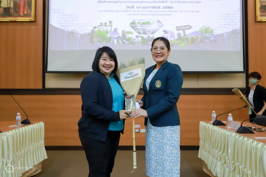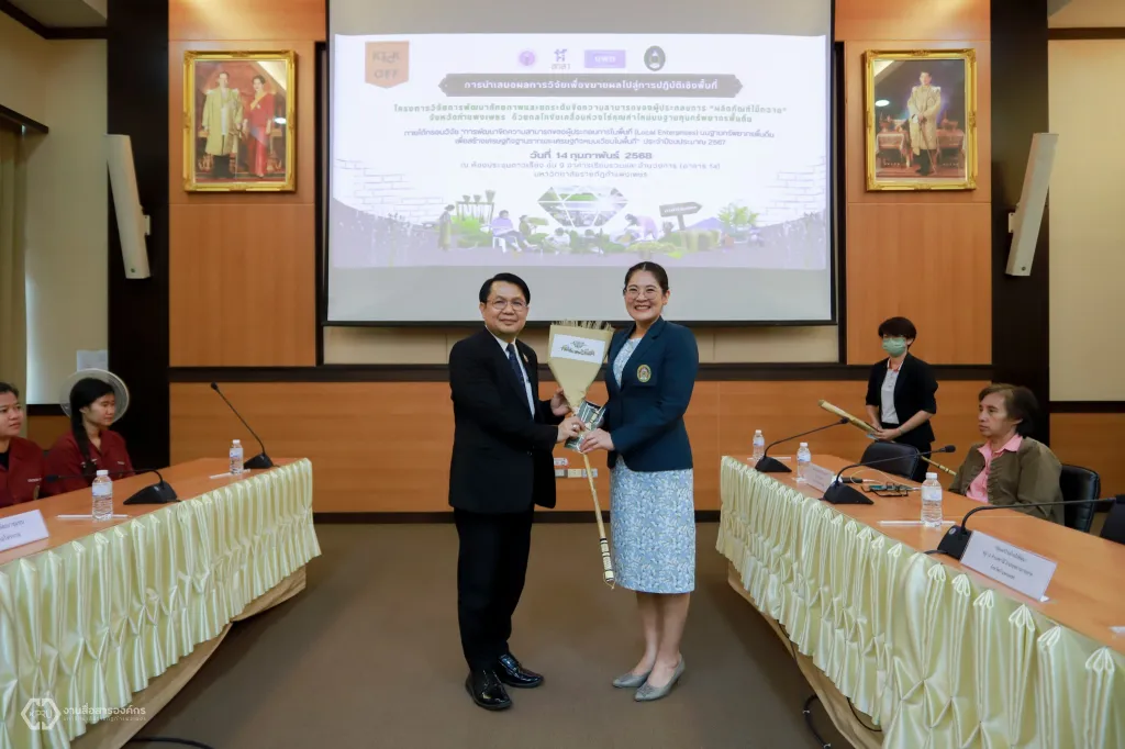 วันที่ 14 กุมภาพันธ์ 2568 ที่ห้องประชุมดาวเรือง ชั้ง 9 อาคารเรียนรวมและอำนวยการ นายวันนี นนท์ศิริ ผู้ตรวจราชการกระทรวงการอุดมศึกษา วิทยาศาสตร์ วิจัยและนวัตกรรม (ผตร.อว.) เป็นประธานในการนำเสนอผลการวิจัย เพื่อขยายผลไปสู่การปฏิบัติเชิงพื้นที่ โครงการวิจัย “การพัฒนาศักยภาพและยกระดับขีดความสามารถของผู้ประกอบการผลิตภัณฑ์ไม้กวาด จังหวัดกำแพงเพชร ด้วยกลไกขับเคลื่อนห่วงโซ่คุณค่าใหม่บนฐานทุนทรัพยากรพื้นถิ่น” ภายใต้กรอบวิจัย “การพัฒนาขีดความสามารถของผู้ประกอบการในพื้นที่ (Local Enterprises)