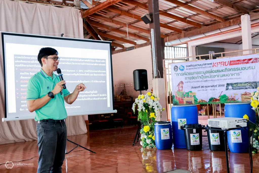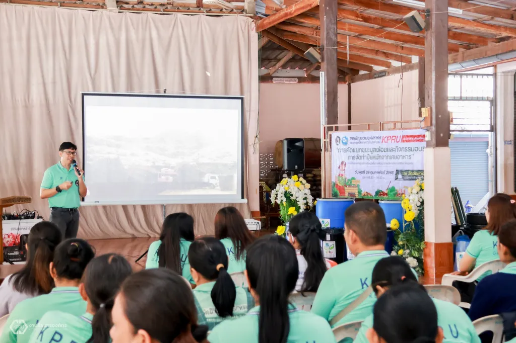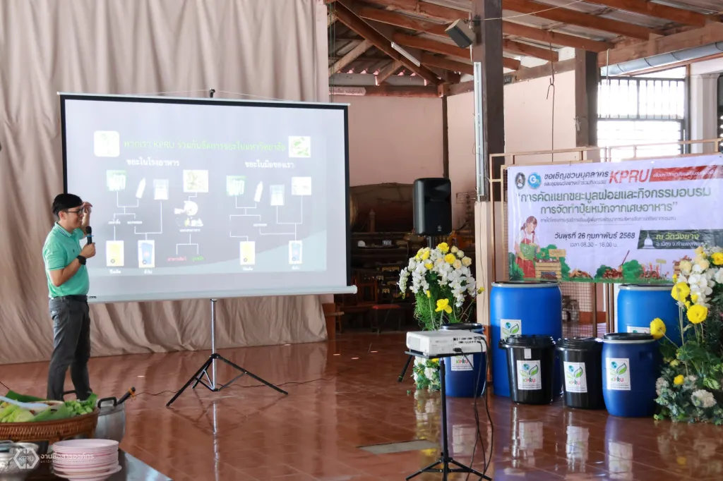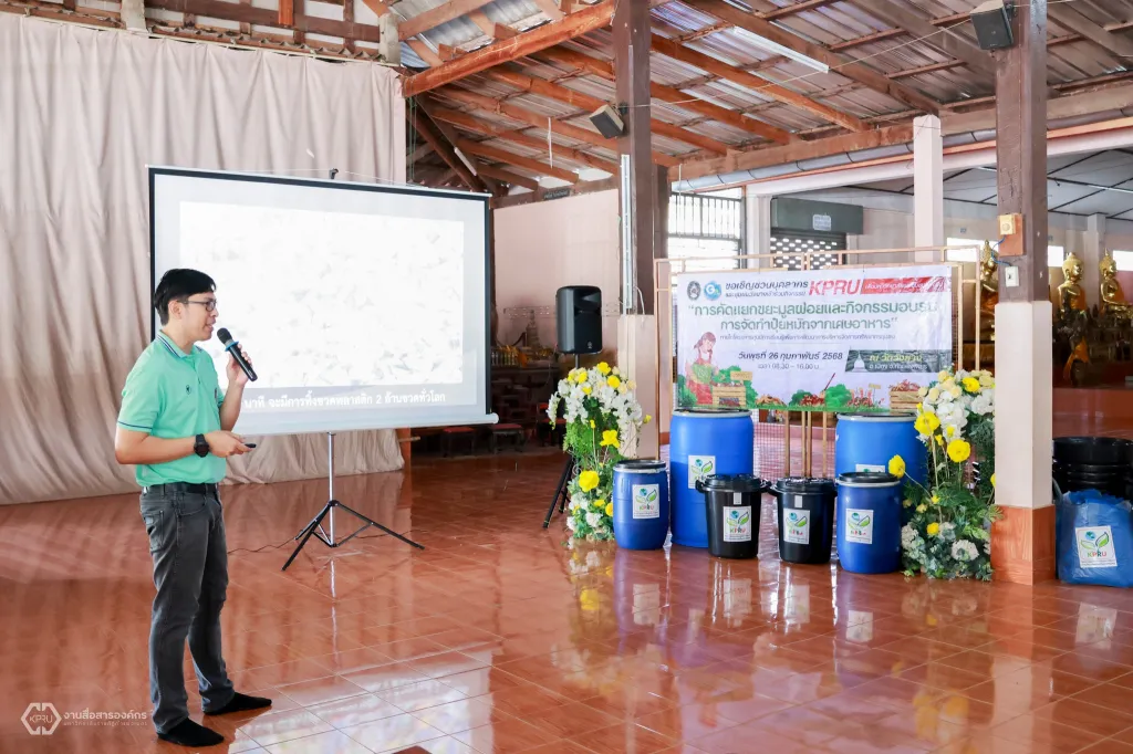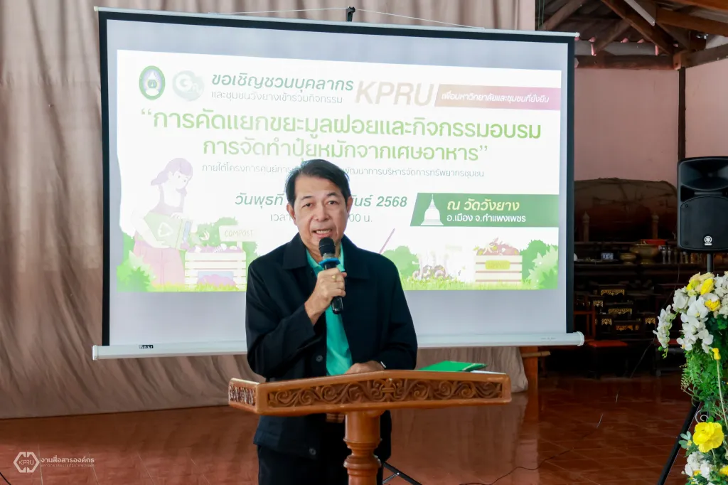 วันที่ 26 กุมภาพันธ์ 2568 กองกลาง สำนักงานอธิการบดี มหาวิทยาลัยราชภัฏกำแพงเพชรจัดกิจกรรมการคัดแยกขยะมูลฝอยและกิจกรรมอบรมการจัดทำปุ๋ยหมักจากเศษอาหาร ภายใต้โครงการศูนย์การเรียนรู้เพื่อการพัฒนาการบริหารจัดการทรัพยากรชุมชน โดยมีผู้ช่วยศาสตราจารย์ ดร.ชัชชัย พวกดี รองอธิการบดีฝ่ายบริหาร เป็นประธานเปิดโครงการฯ พร้อมด้วย ดร.มะลิวัลย์ รอดกำเหนิด ผู้อำนวยการกองกลาง นายธณัฐ เมธาวีกุลชัย ปลัด อบต.นครชุม นายภูมิรักษ์ มีอุสาห์ ผู้ใหญ่บ้านหมู่ 1 บุคลากรมหาวิทยาลัยราชภัฏกำแพงเพชร ผู้แทนชุมชน ม.1 - ม. 13 อบต.นครชุม ผู้ประกอบการในพื้นที่่โดยรอบมหาวิทยาลัยฯ เข้าร่วมการอบรม ณ วัดวังยาง อ.เมือง จ.กำแพงเพชร