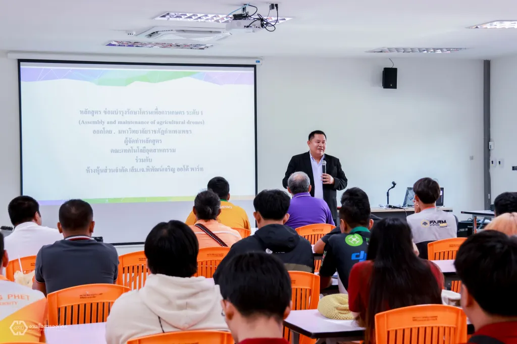 สำหรับโครงการซ่อมบำรุงรักษาโดรนเพื่อการเกษตร ระดับ 1 จัดขึ้นระหว่างวันที่ 15 - 17 สิงหาคม 2567 มีวัตถุประสงค์เพื่อส่งเสริมการพัฒนาความสามารถด้านการซ่อมโดรนเพื่อการเกษตรให้ช่างในชุมชน เกิดการสร้างงานสร้างอาชีพ สร้างรายได้ให้เกษตรกร รวมถึงเพิ่มมูลค่าทางเศรษฐกิจให้ประเทศ ซึ่งได้รับเกียรติจาก คุณนิมิตร ชัยพิพัฒน์ ผู้จัดการห้างหุ้นส่วนจำกัด เอ็ม.เจ. พิพัฒน์เจริญออโต้พาร์ท และผู้ช่วยศาสตราจารย์ ดร.อานนท์ วงษ์มณี เป็นวิทยากร และมีผู้เข้าร่วมโครงการฝึกอบรมฯ จำนวน 40 คน