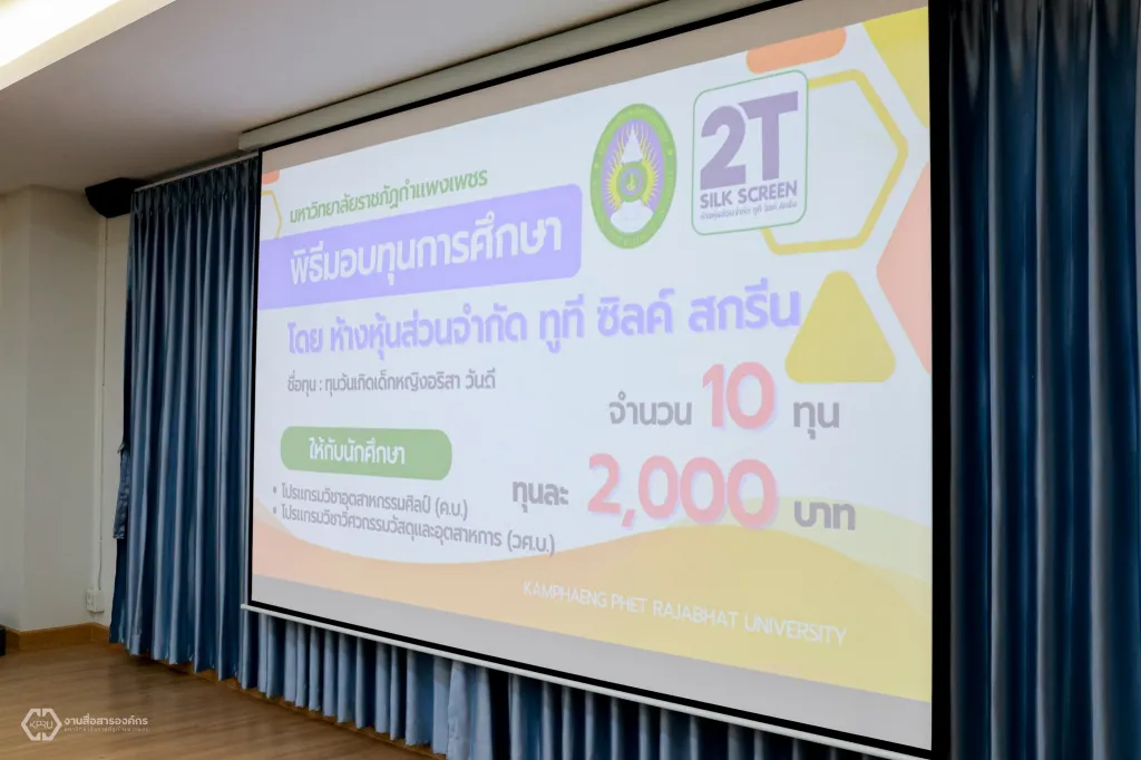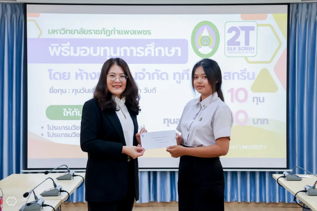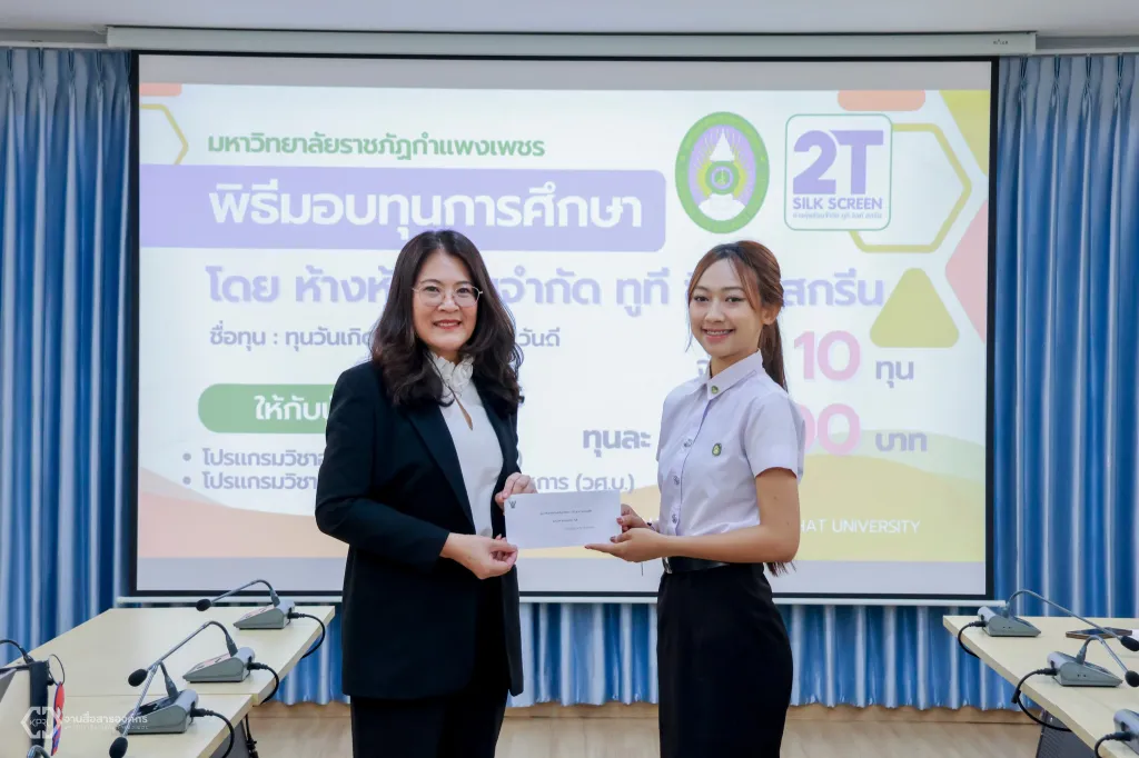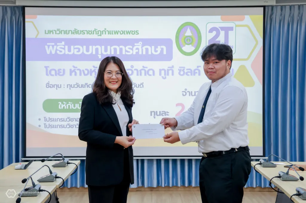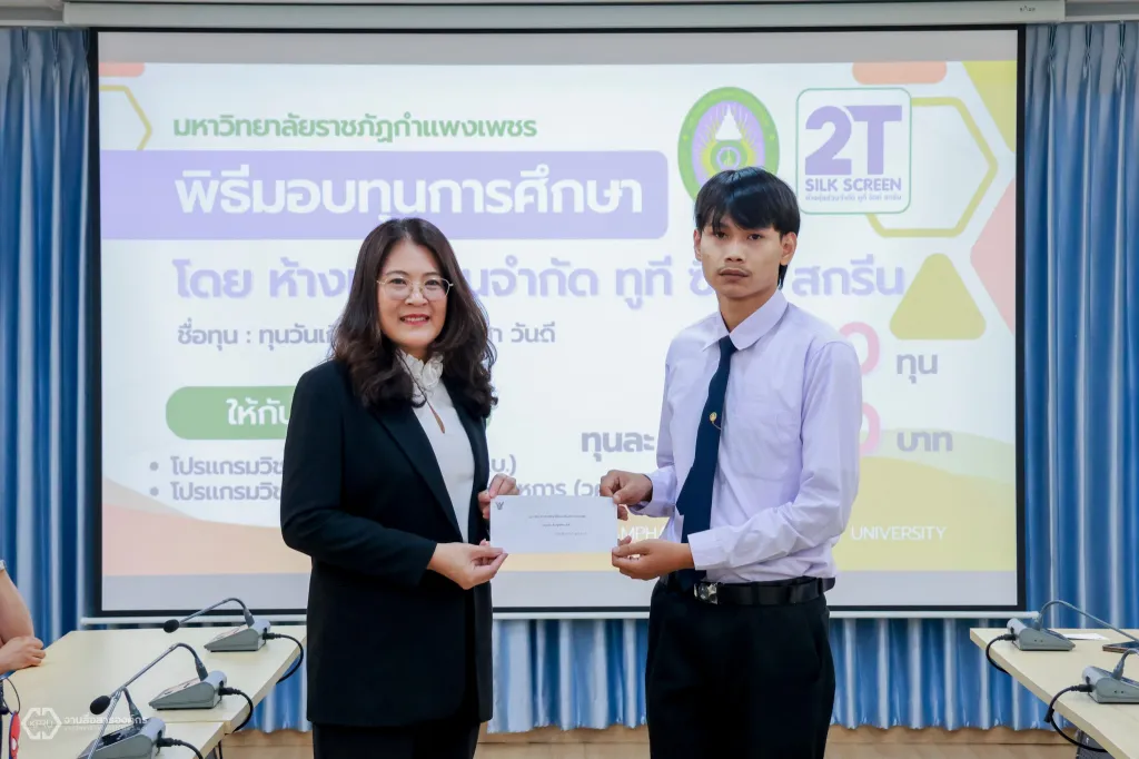 วันพฤหัสบดีที่ 12 ธันวาคม 2567 ผู้ช่วยศาสตราจารย์ ดร.ปรียานุช พรหมภาสิต อธิการบดีมหาวิทยาลัยราชภัฏกำแพงเพชร เป็นผู้แทนมอบทุนการศึกษา จำนวน 10 ทุน ให้กับนักศึกษา สาขาวิชาการศึกษาวิชาเอกอุตสาหกรรมศิลป์ และสาขาวิชาวิศวกรรมเทคโนโลยีวิชาเอกวิศวกรรมวัสดุและอุตสาหการ ณ ห้องประชุมเล็ก (ชั้น 2) คณะเทคโนโลยีอุตสาหกรรม มหาวิทยาลัยราชภัฏกำแพงเพชร