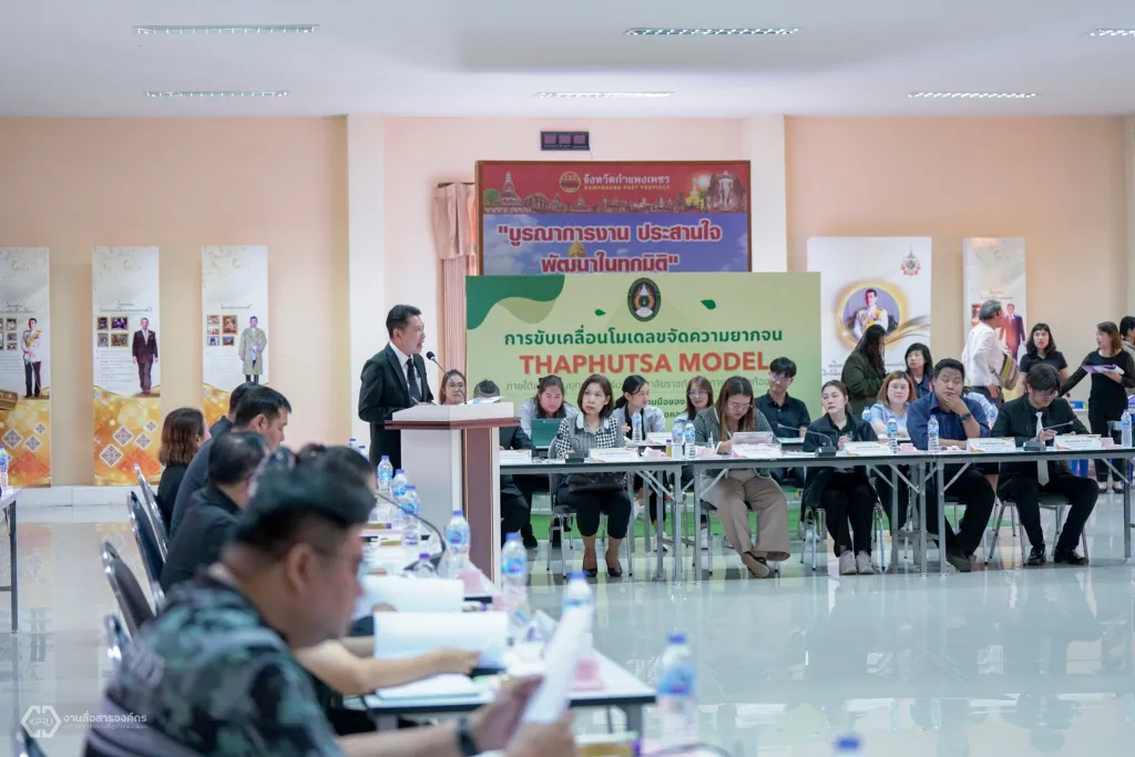 โครงการโมเดลขจัดความยากจน THAPHUTSA MODEL โดยมหาวิทยาลัยราชภัฏกำแพงเพชร เป็นการขับเคลื่อนการพัฒนาพื้นที่ เพื่อขจัดปัญหาความยากจน โดยบูรณาการพื้นที่ 5 ภาคส่วน ประกอบด้วย องค์กรปกครองส่วนท้องถิ่น ภาคเอกชน มหาวิทยาลัยราชภัฏกำแพงเพชร ที่ว่าการอำเภอคลองขลุง และกลุ่มวิสาหกิจชุมชน โดยอธิการบดี ได้เสนอกรอบแนวทางการดำเนินงานตามแผนยุทธศาสตร์มหาวิทยาลัยราชภัฏเพื่อการพัฒนาท้องถิ่น ประกอบด้วย 4 แผนงาน 8 แผนงานย่อย ครอบคลุมทั้งมิติเศรษฐกิจ มิติสังคม มิติสุขภาพ มิติสิ่งแวดล้อม และมิติการศึกษา โดยหลังจากนั้น ผู้เข้าร่วมประชุมจากองค์กรปกครองส่วนท้องถิ่น ภาคเอกชน อำเภอคลองขลุง ผู้แทนประชาชนและกลุ่มวิสาหกิจชุมชน ได้เสนอปัญหา ความต้องการพัฒนาและข้อเสนอแนะในการขับเคลื่อนโมเดล ผลที่ได้จากการประชุมในวันนี้ ทุกภาคส่วนได้เข้าใจร่วมกันในการขับเคลื่อนโมเดลขจัดความยากจน THAPHUTSA MODEL ข้อสรุปปัญหาและความต้องการ ของภาคส่วนต่างๆ