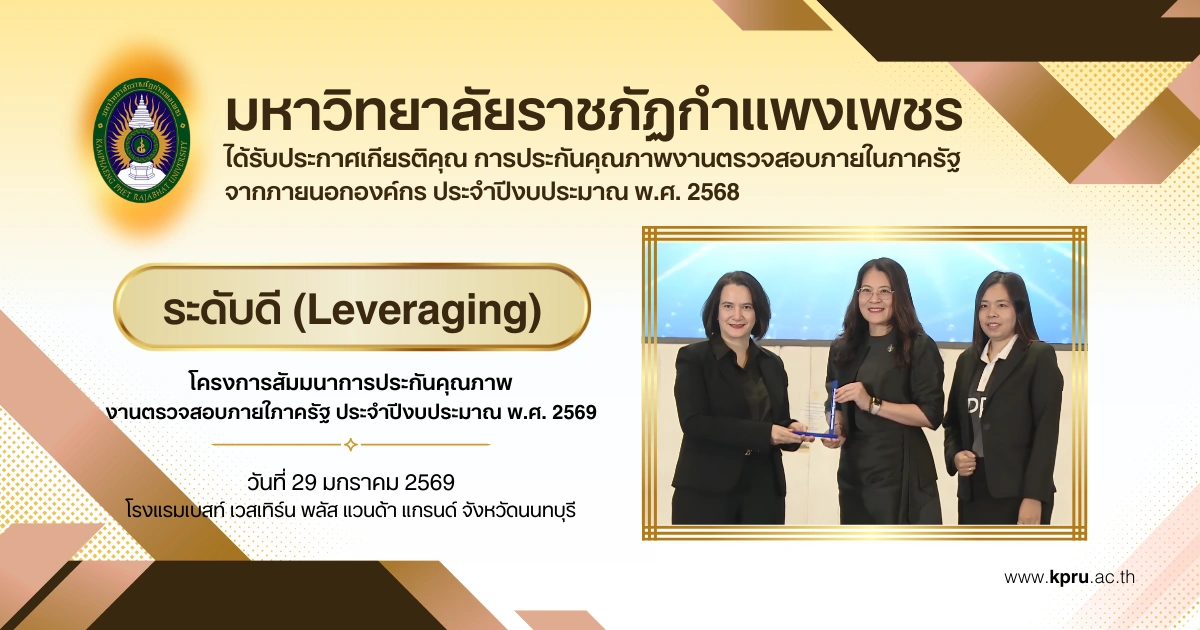 วันที่ 29 มกราคม 2569 ผู้ช่วยศาสตราจารย์ ดร.ปรียานุช พรหมภาสิต อธิการบดีมหาวิทยาลัยราชภัฏกำแพงเพชร เข้ารับรางวัลประกาศเกียรติ การประกันคุณภาพงานตรวจสอบภายในภาครัฐจากภายนอกองค์กรภาพรวม #ระดับดี ประจำปีงบประมาณ พ.ศ. 2568 จากนางแพตริเซีย มงคลวณิช อธิบดีกรมบัญชีกลาง ในงานโครงการสัมมนาการประกันคุณภาพงานตรวจสอบภายใภาครัฐ ประจำปีงบประมาณ พ.ศ. 2569 ณ โรงแรมเบสท์ เวสเทิร์น พลัส แวนด้า แกรนด์ จังหวัดนนทบุรี