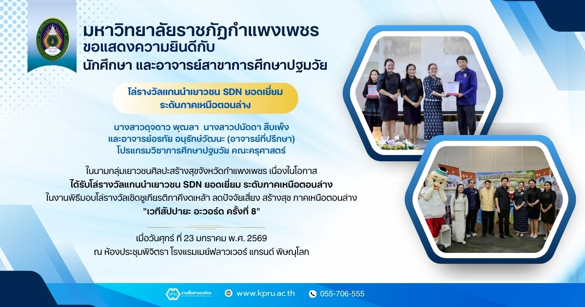 เมื่อวันศุกร์ที่ 23 มกราคม 2569 ที่ห้องประชุมพิจิตรา โรงแรมเมย์ฟลาวเวอร์ แกรนด์ พิษณุโลก อาจารย์อรทัย อนุรักษ์วัฒนะ (อาจารย์ที่ปรึกษา) พร้อมด้วยนางสาวดุจดาว พุฒลา และนางสาวปนัดดา สืบเพ็ง โปรแกรมวิชาการศึกษาปฐมวัย คณะครุศาสตร์ มหาวิทยาลัยราชภัฏกำแพงเพชร ในนามกลุ่มเยาวชนศิลปะสร้างสุขจังหวัดกำแพงเพชร ได้รับ "โล่รางวัลแกนนำเยาวชน SDN ยอดเยี่ยม" ระดับภาคเหนือตอนล่าง ในงานพิธีมอบโล่รางวัลเชิดชูเกียรติภาคีงดเหล้า ลดปัจจัยเสี่ยง สร้างสุข ภาคเหนือตอนล่าง “เวทีสัปปะยะ อะวอร์ด ครั้งที่ 8”