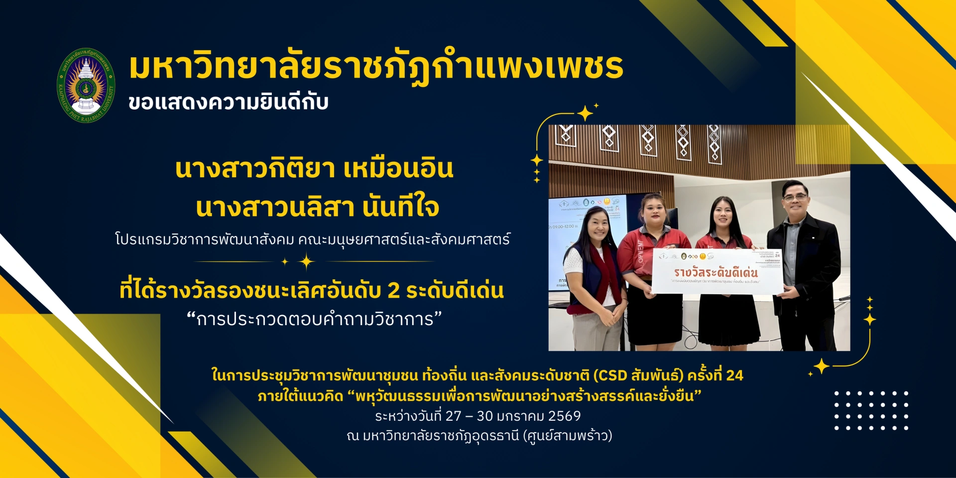 ◾ มหาวิทยาลัยราชภัฏกำแพงเพชร ขอแสดงความยินดีกับนักศึกษาโปรแกรมวิชาการพัฒนาสังคม คณะมนุษยศาสตร์และสังคมศาสตร์ ที่ได้รับรางวัลดังนี้
