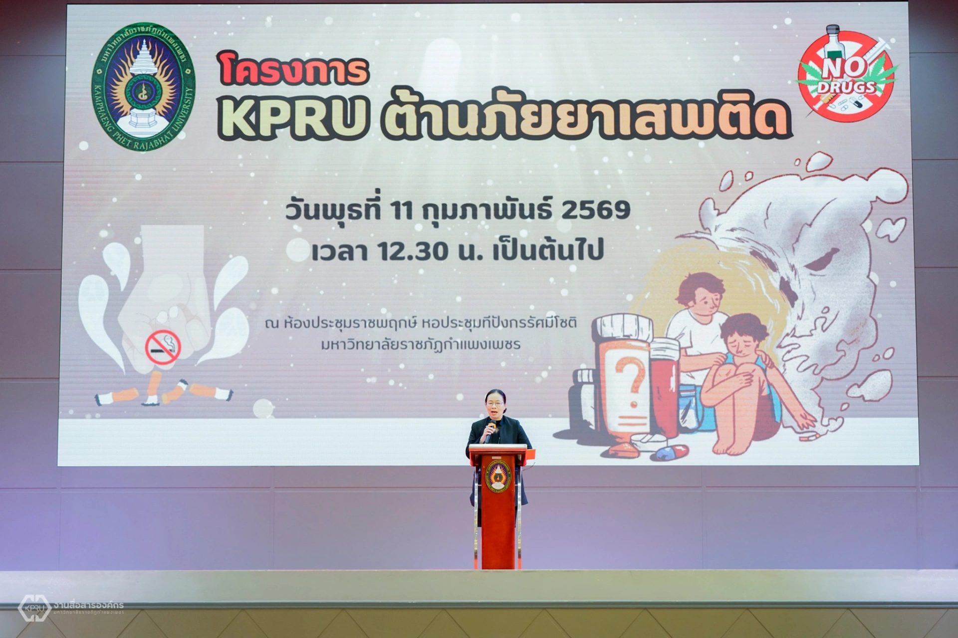 เมื่อวันที่ 11 กุมภาพันธ์ 2569 รองศาสตราจารย์ ดร.พธูรำไพ ประภัสสร รองอธิการบดีฝ่ายกิจการนักศึกษาและศิลปวัฒนธรรม เป็นประธานในพิธีเปิดโครงการ KPRU ต้านภัยยาเสพติด โดยมีนักศึกษาชั้นปีที่ 2 เข้าร่วมกิจกรรมฯ ณ ห้องประชุมราชพฤกษ์ ชั้น 3 อาคารทีปังกรรัศมีโชติ มหาวิทยาลัยราชภัฏกำแพงเพชร