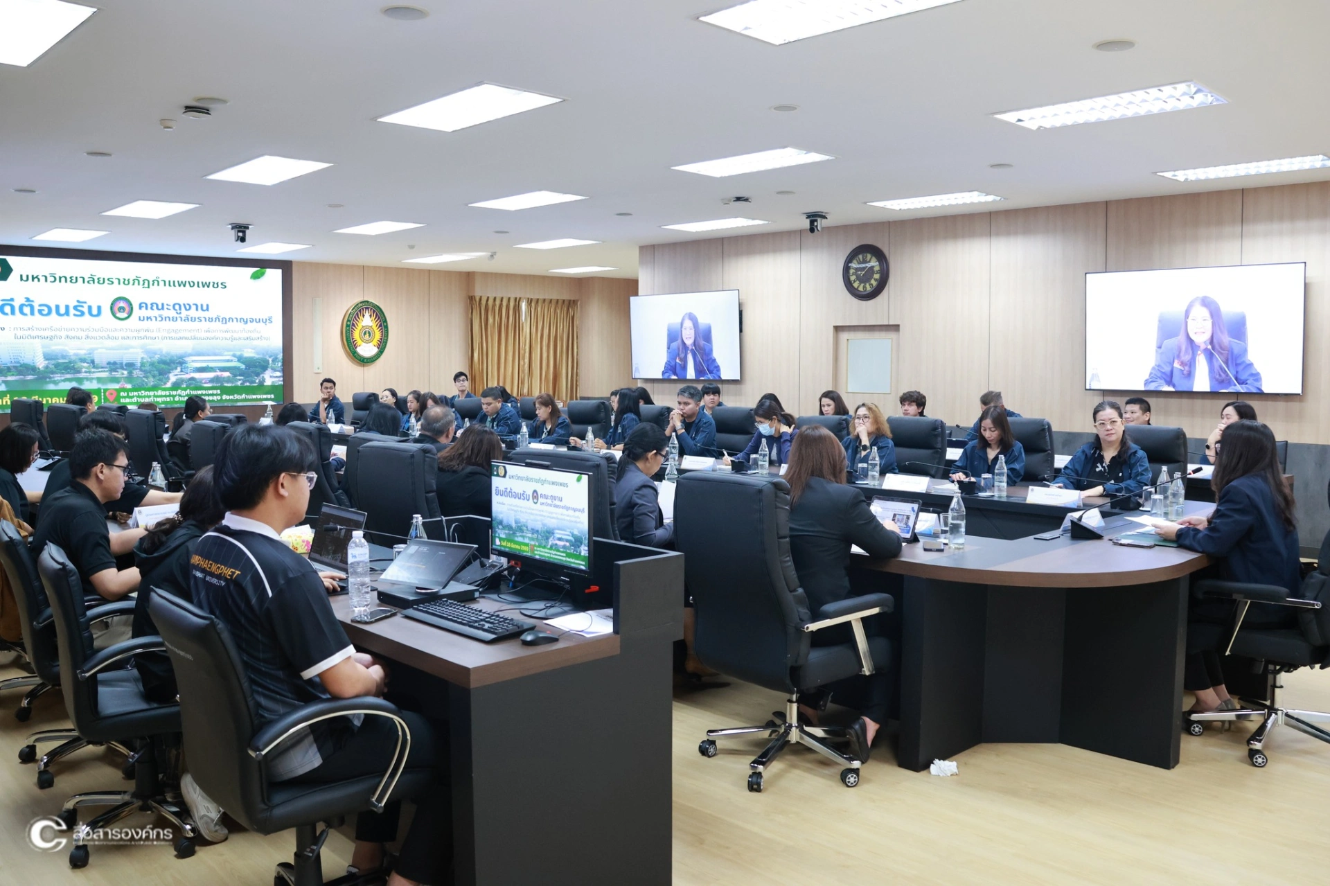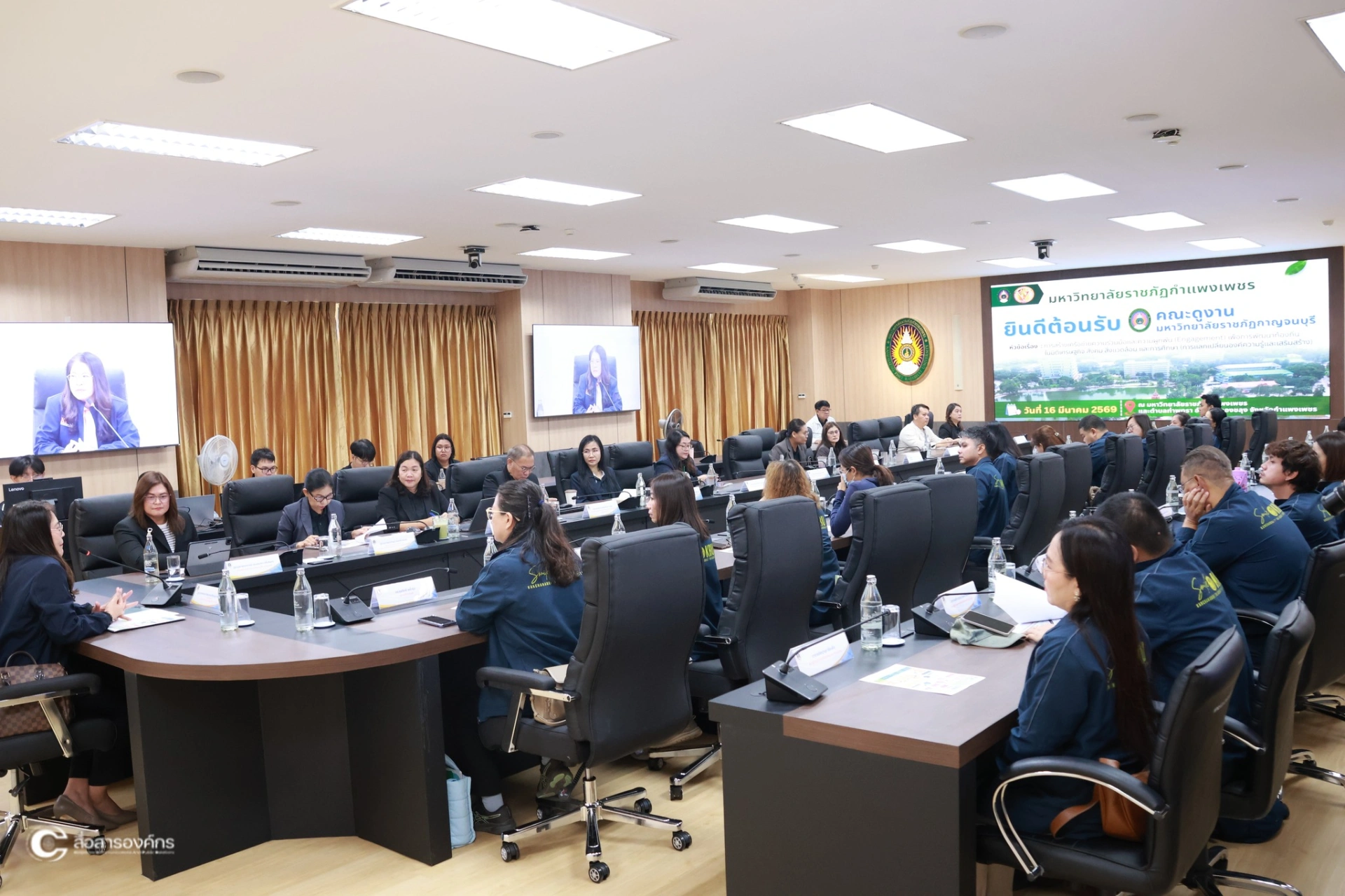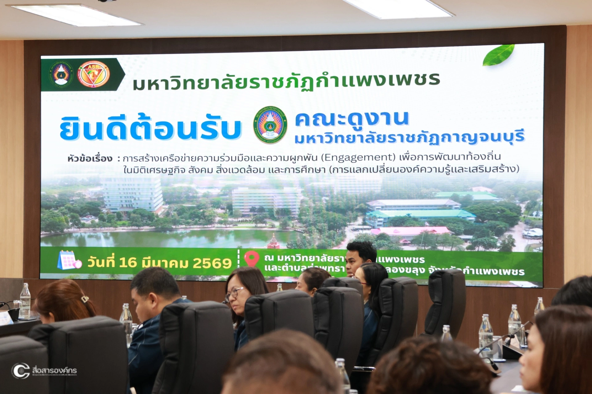 วันที่ 16 มีนาคม 2569 ผศ.ดร.ปรียานุช พรหมภาสิต อธิการบดี กล่าวต้อนรับ คณะศึกษาดูงานมหาวิทยาลัยราชภัฏกาญจนบุรี เพื่อรับฟังการบรรยายและแลกเปลี่ยนเรียนรู้เกี่ยวกับการขับเคลื่อนโมเดลขจัดความยากจน “ท่าพุทราโมเดล” ภายใต้แผนงานยุทธศาสตร์มหาวิทยาลัยราชภัฏเพื่อการพัฒนาท้องถิ่น ณ ห้องประชุมรวงผึ้ง ชั้น 8 อาคารเรียนรวมและอำนวยการ (อาคาร 14) มหาวิทยาลัยราชภัฏกำแพงเพชร